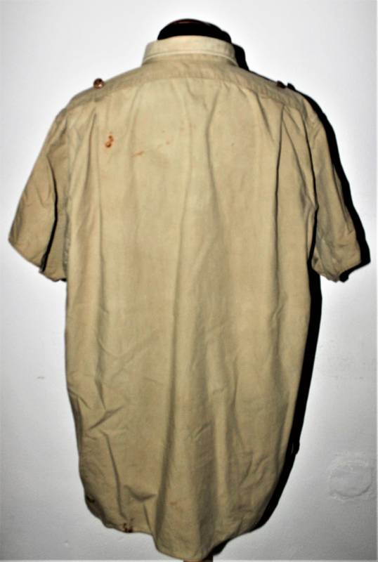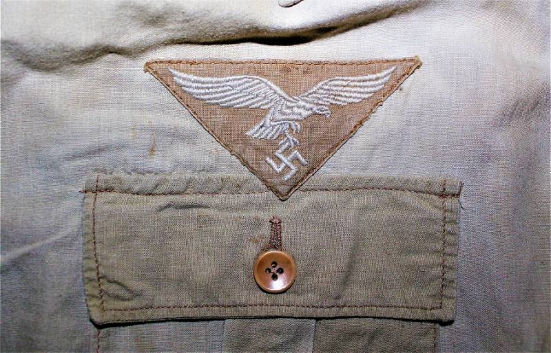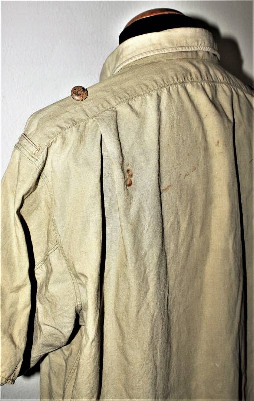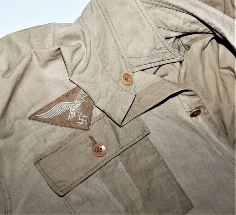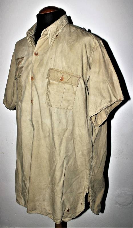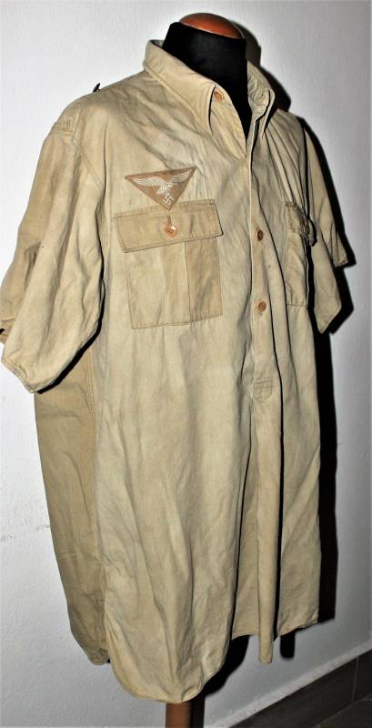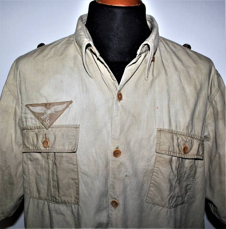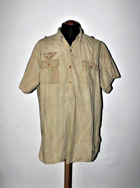 Camicia tropicale della Luftwaffe nata in cotone colore giallo, modello a maniche corte, completa di aquila cucita a macchina in epoca, condizioni buone ma usata, senza buchi o strappi e cucitture perfette, solo qualche piccola macchia di ruggine (vedi foto), sul colletto sŽintravede le marcature dellŽanno e della taglia. Taglia grande circa 50. Originale 100% WWII periodo.