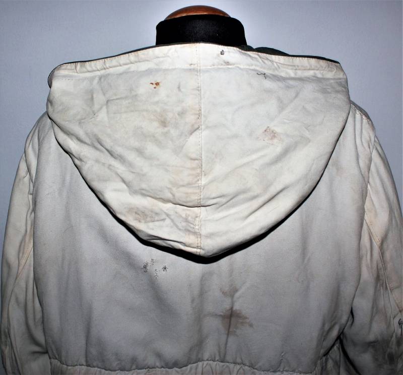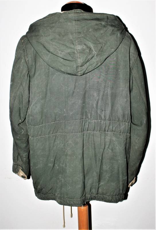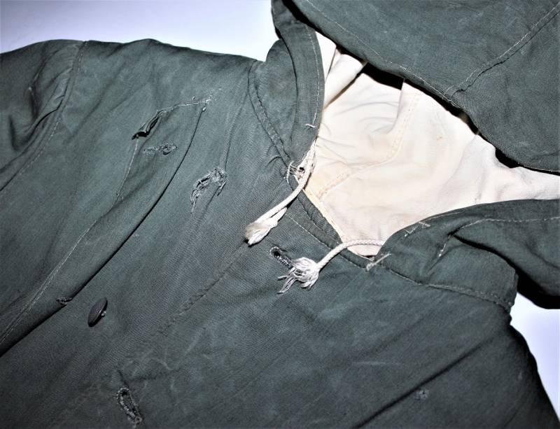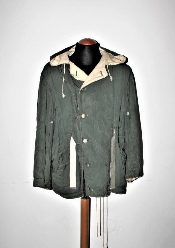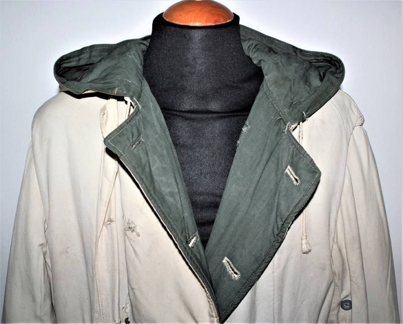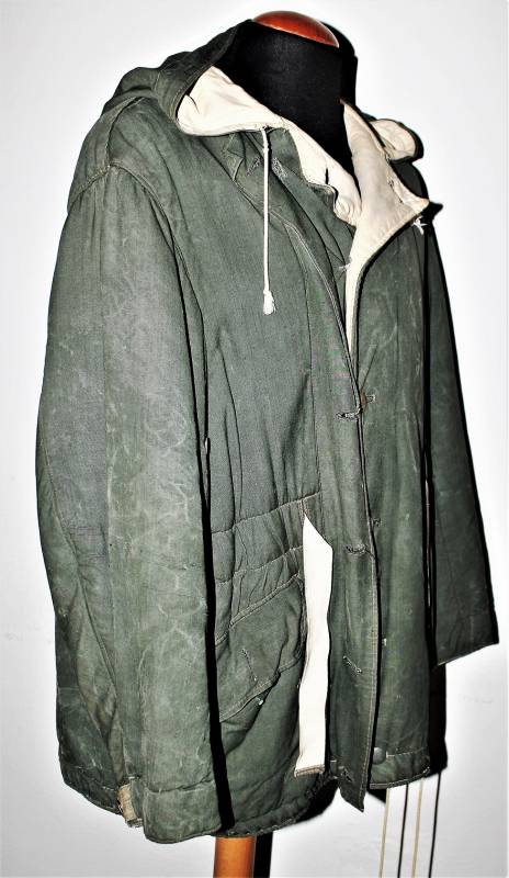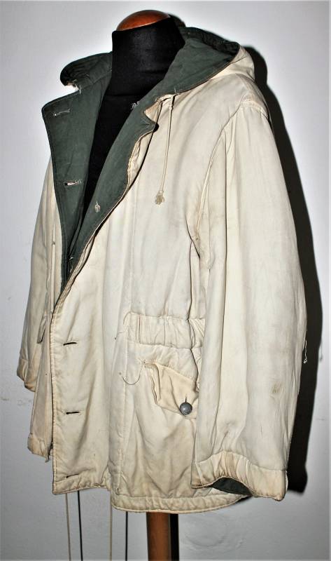 Giaccone reversibile due colori verde e bianco in discrete condizioni ma usato, molta patina del tempo e dellŽuso, sulla parte bianca mancano 4 bottoni e ci sono alcuni rammendi al posto dei bottoni, nel complesso ancora con molto fascino.