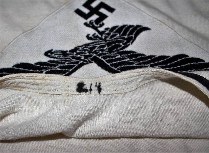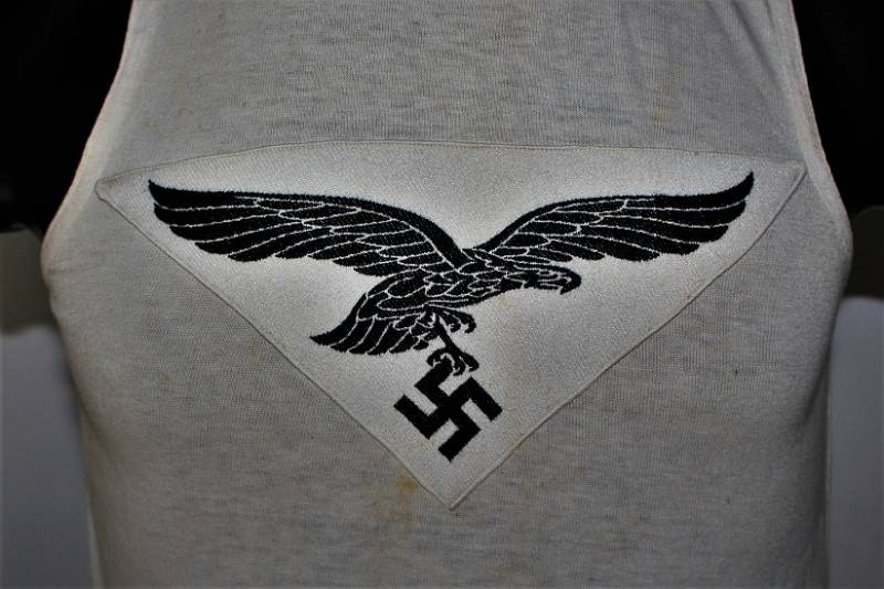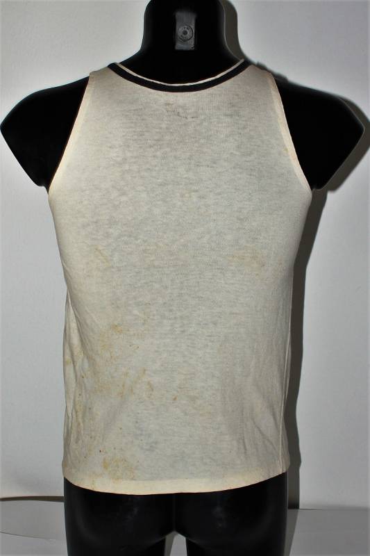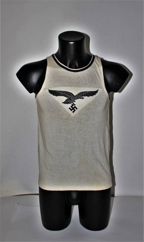 Canottiera in cotone bianco sportiva per la Luftwaffe con emblema cucito a macchina sul petto, condizioni ottime con leggera patina del tempo e dellŽuso, ma sana senza buchi o strappi. Taglia circa 46-48. Originale 100% WWII periodo.
