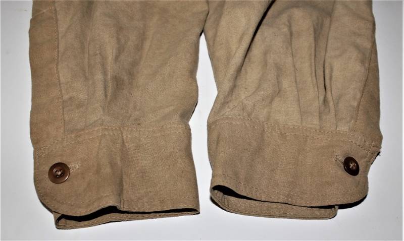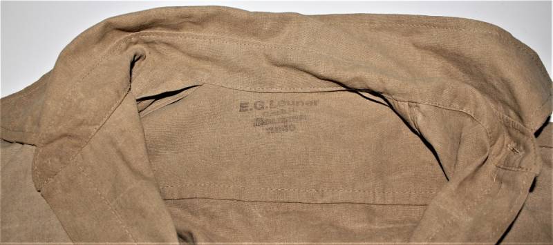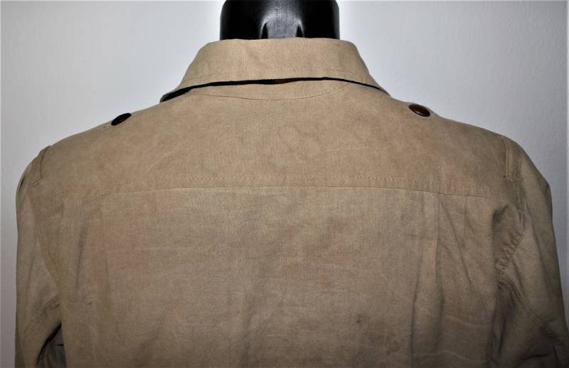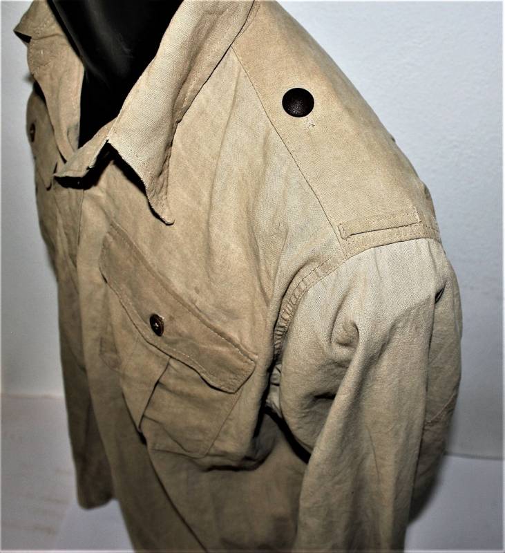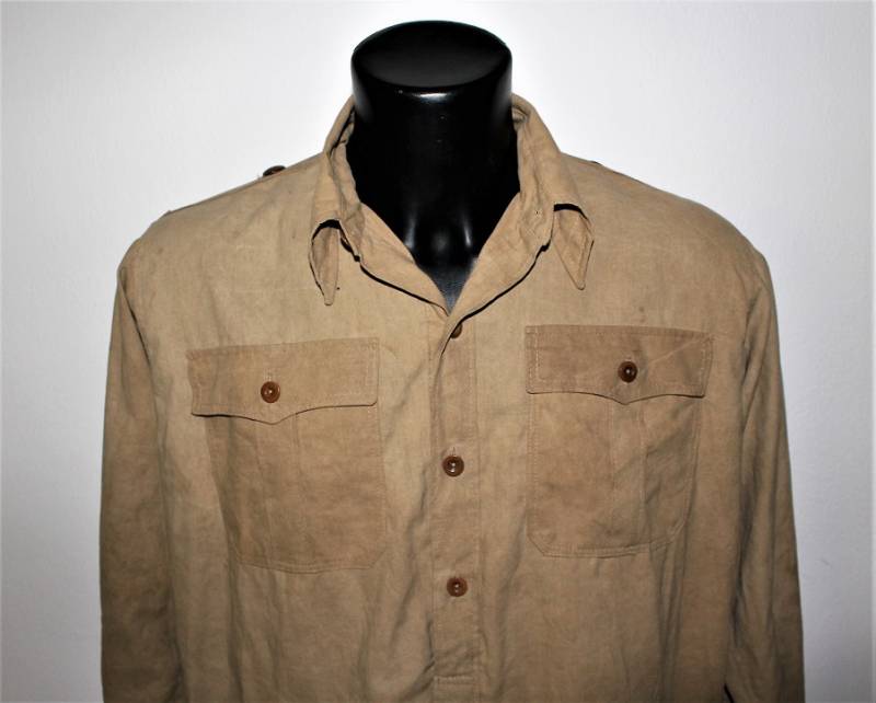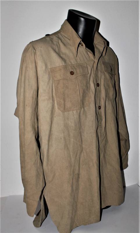 Camicia di servizio tropicale D.A.K. modello manica lunga, nata in cotone tipica colorazione tropicale, condizioni ottime quasi pari al nuovo, senza buchi o strappi, non restaurata, marcata con nome fabbricante e data 1940. Taglia medio-grande. Originale 100% WWII periodo.
