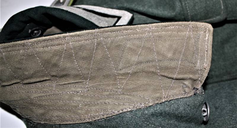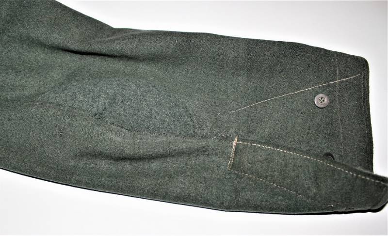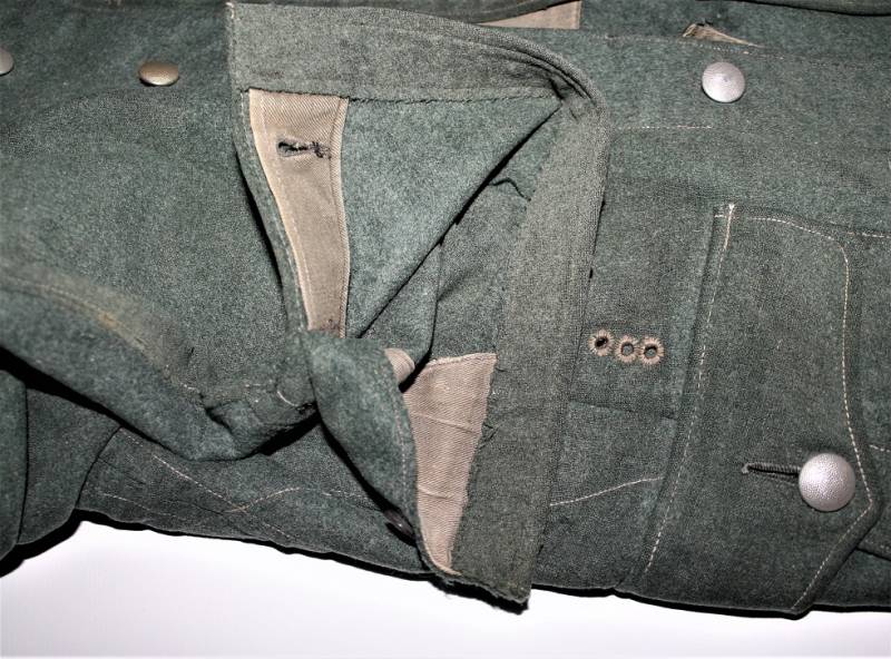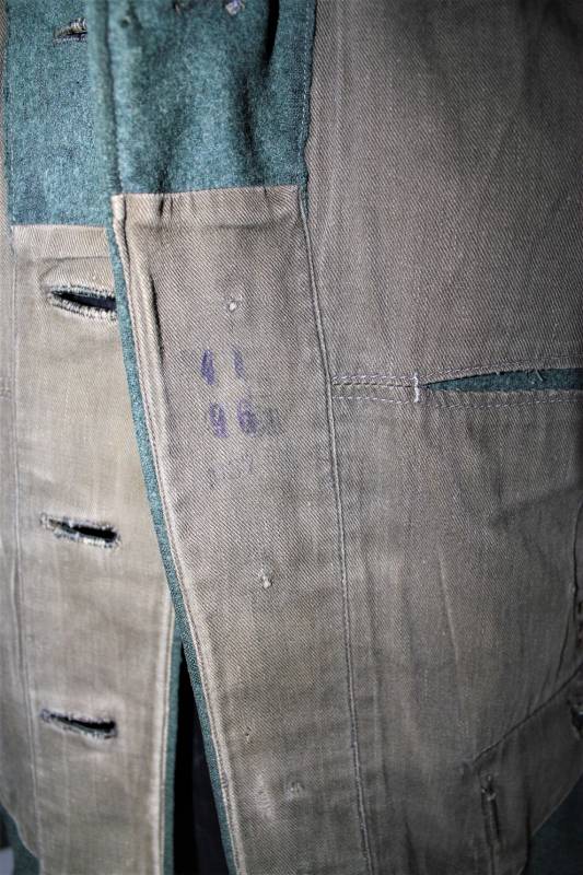 Giacca M36 da Sottufficiale della WH Panzergrenadier waffenfarbe verde mela, condizioni molto usate con alcuni buchi rammendati e due toppe sulle maniche, ma non modificata, completa di tutta la sua mostreggiatura montata in epoca, all´interno s´intravede le marcature delle taglie, vissuta ma molto suggestiva. Originale 100% WWII periodo.