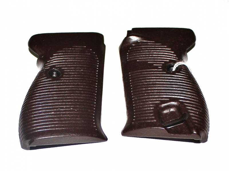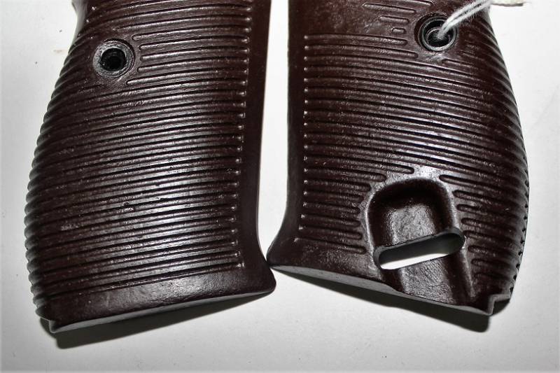 Coppia di guancette in bakelite marrone-rossa per pistola Walther P38, in condizioni perfette, mai usate, marcate internamente con codice. Originale 100% WWII periodo.