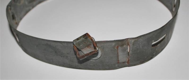 Cerchione zincato per elmetto mod.40-42, completo e in buono stato, con patina del tempo e dellŽuso, taglia ferro ET64, per pelle tg.56, marcato con fabbricante e anno. Originale 100% WWII periodo.