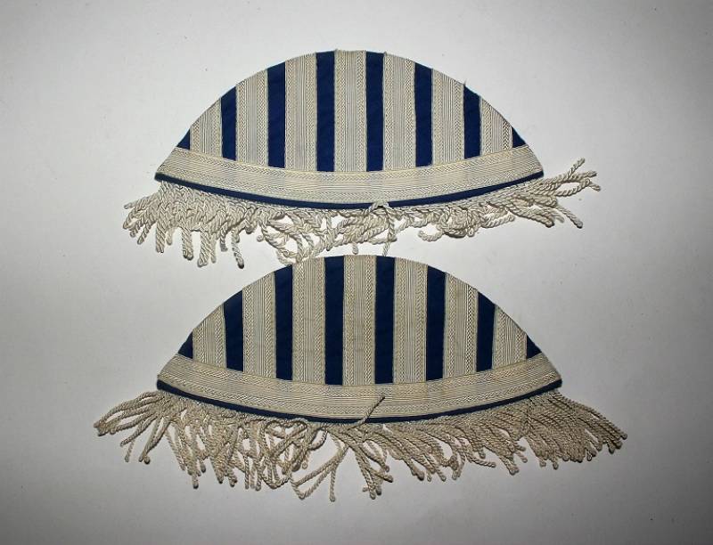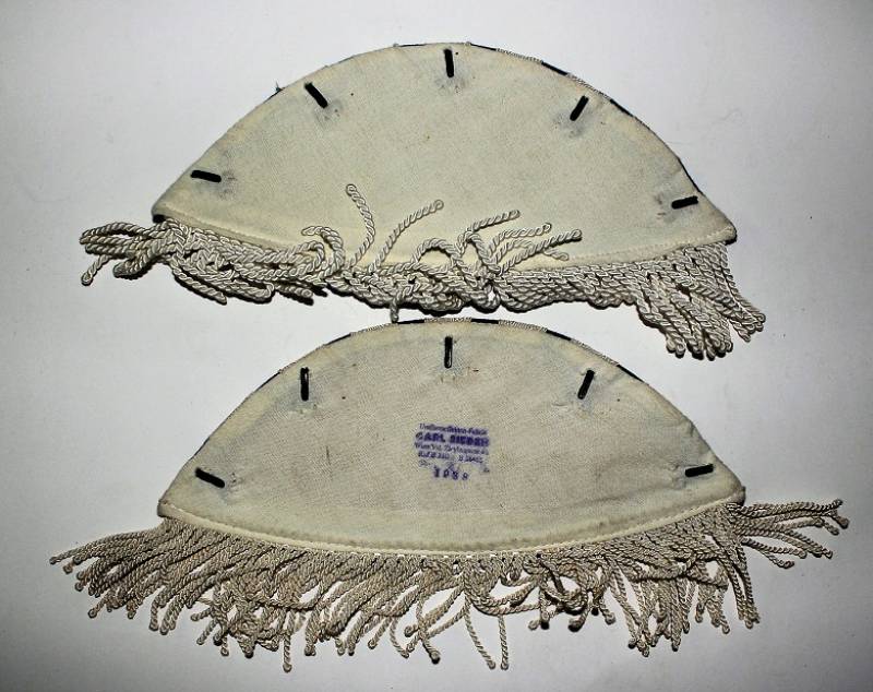 Spalline per giacca da musicante in waffenfarde blu, condizioni ottime pari al nuovo, mai usate, con frange in canottiglia, marcate su retro con fabbricante e data 1938. Originale 100% WWII periodo.