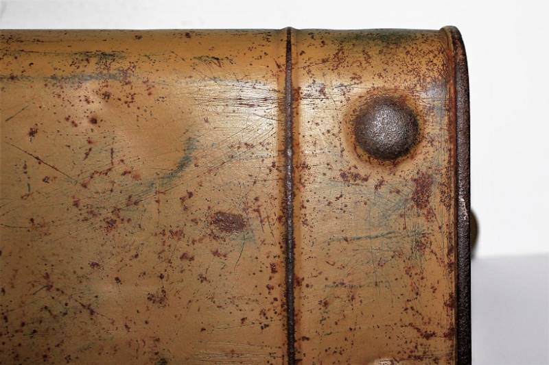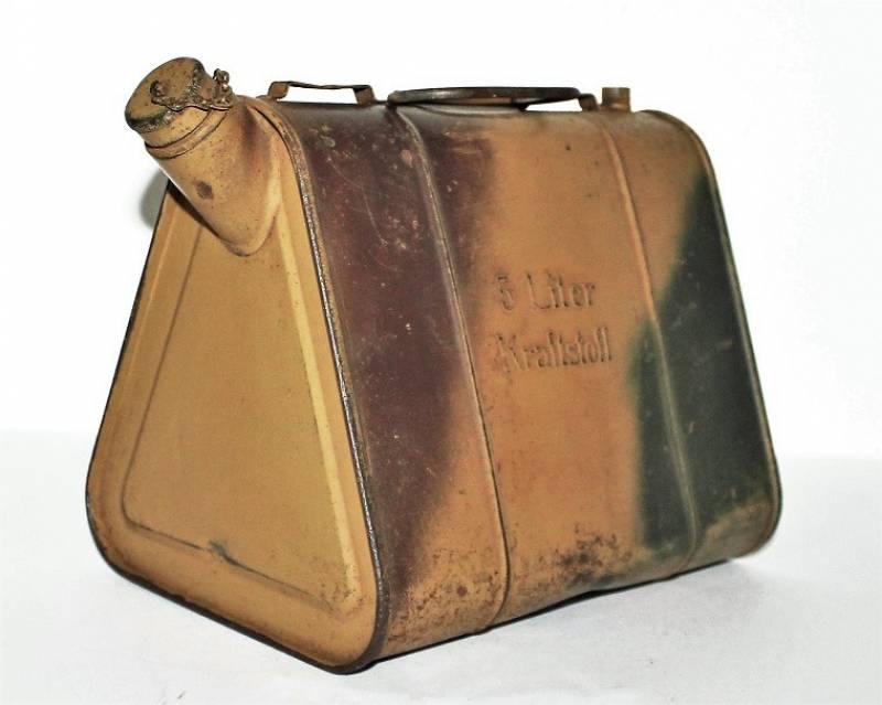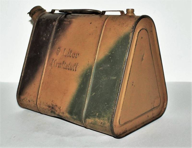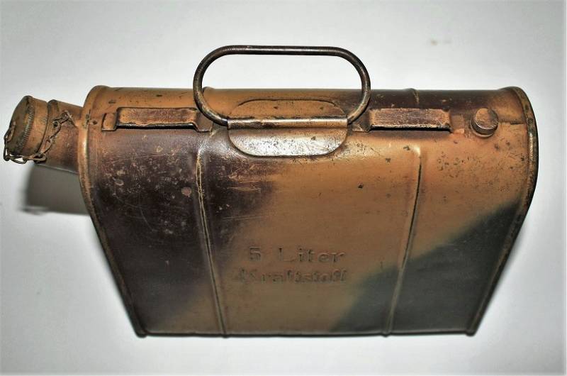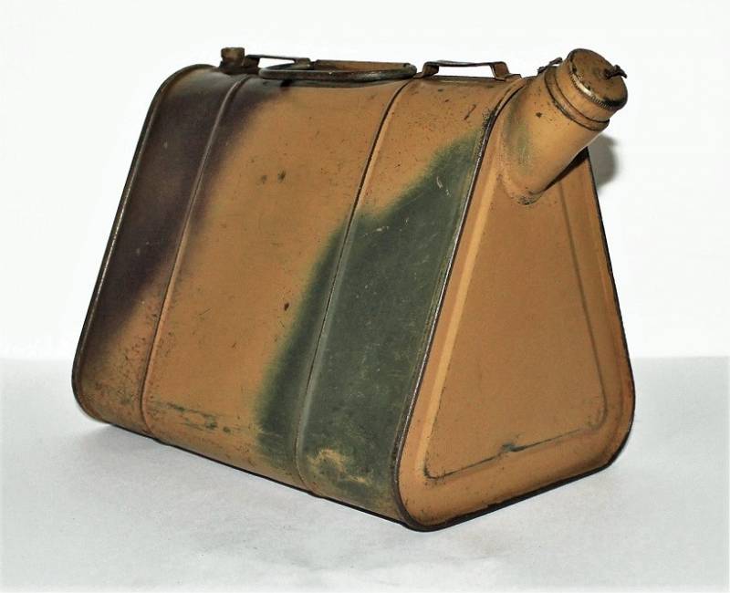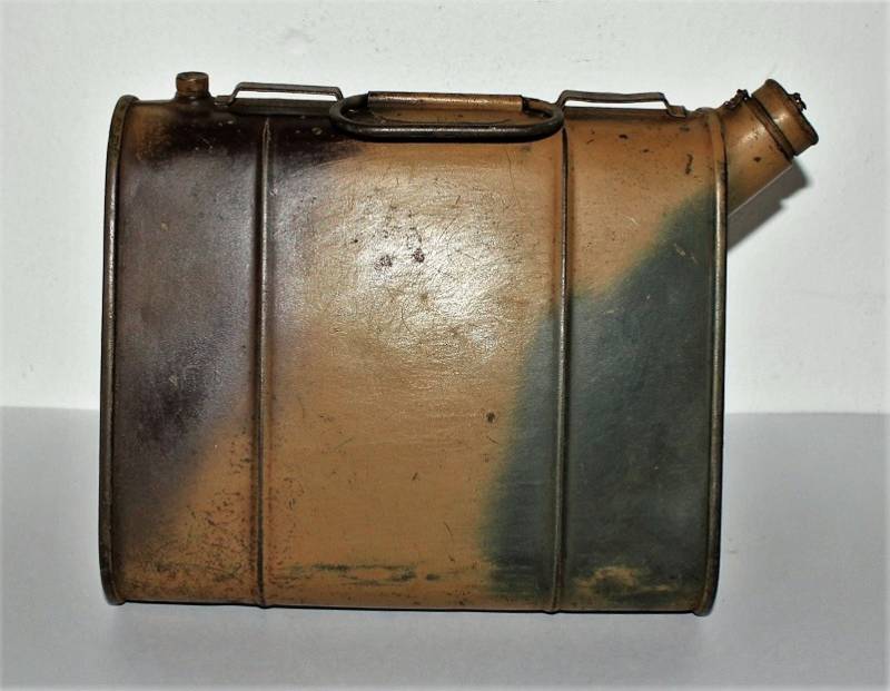 Stagnina triangolare carburante da 5l, nata in colorazione mimetica tipica del fronte Normandia, tre toni di colore: giallo, vede e rosso al 90%, leggera patina del tempo e dellŽuso, non restaurata o riparata e completa in ogni sua parte. Originale 100% WWII periodo.