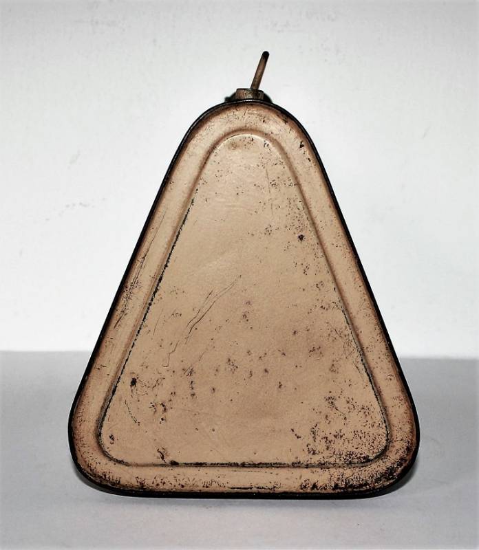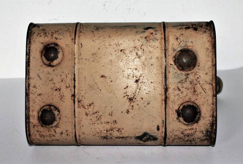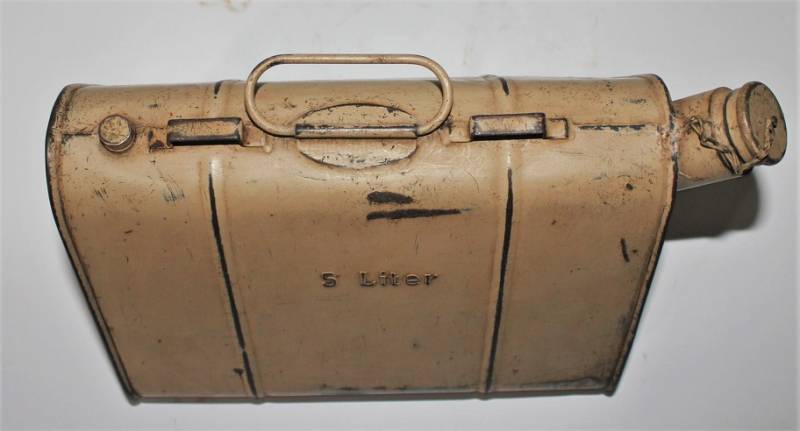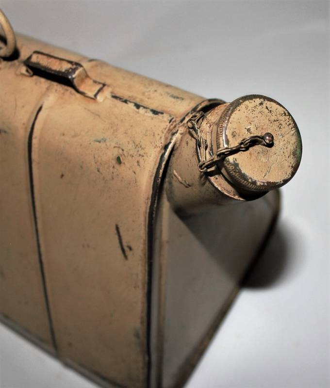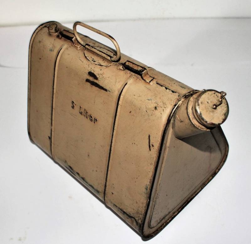 Stagnina triangolare carburante da 5l, nata in colorazione mimetica gialla al 90% tipica fronte Italiano, leggera patina del tempo e dellŽuso, non restaurata o riparata e completa in ogni sua parte. Originale 100% WWII periodo.