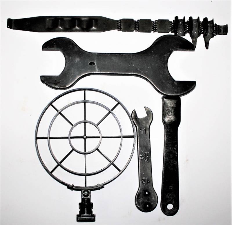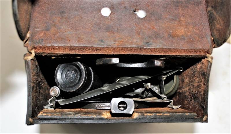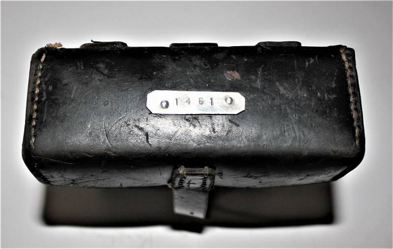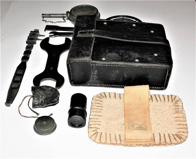 Kit pulizia per MG34 in pelle nera in belle condizioni, non lesionato, non restaurato o riparato, pelle morbida con leggera patina del tempo e dellŽuso, completo di tutti gli accessori, compreso guanto dŽamianto (mancante solo dellŽotturatore), accessori marcati con codice fabbricante e data. Contenitore in pelle marcato con sigla fabbricante, data 1941 e waffenamt. Originale 100% WWII periodo.