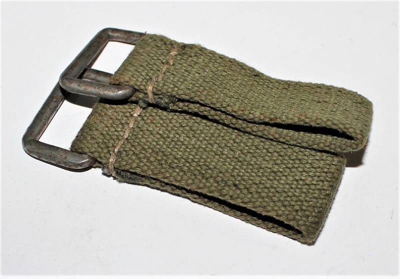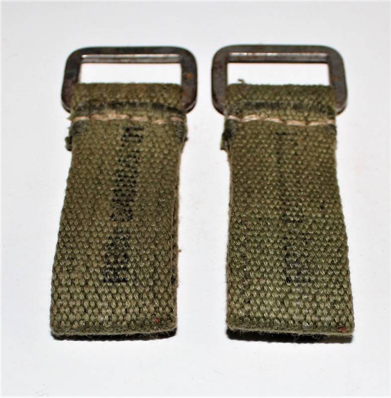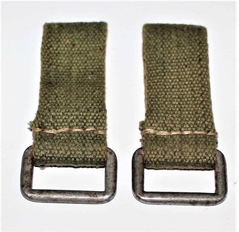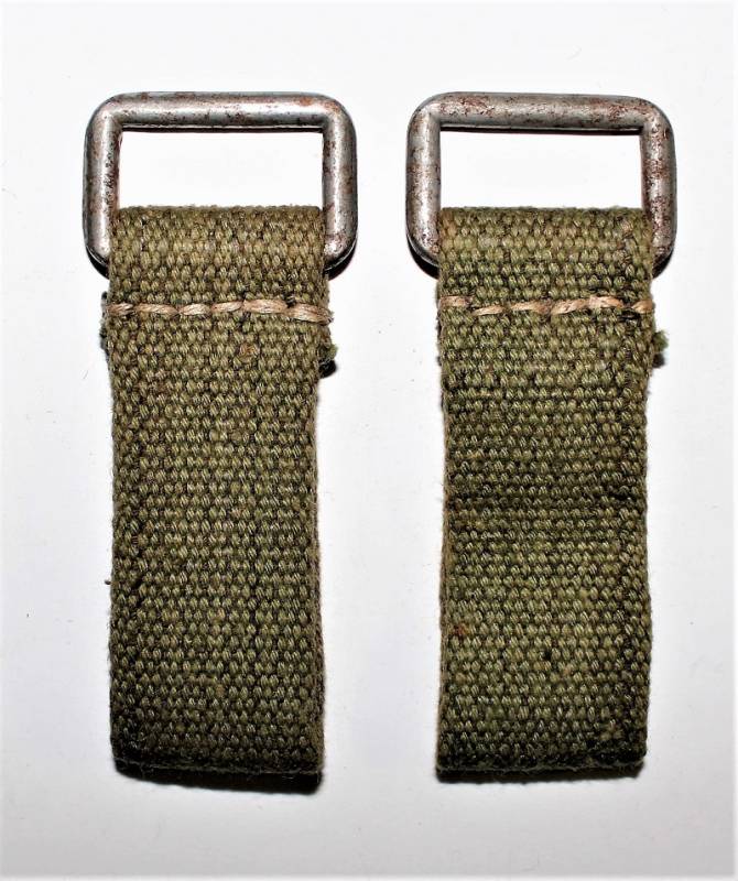 Coppia di ganci a sospensione in tela tropicale D.A.K. colore giallo-verde in condizioni perfette, marcati con RBN N°..... Originale 100% WWII periodo.