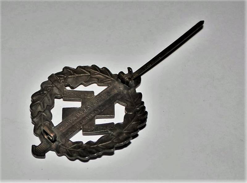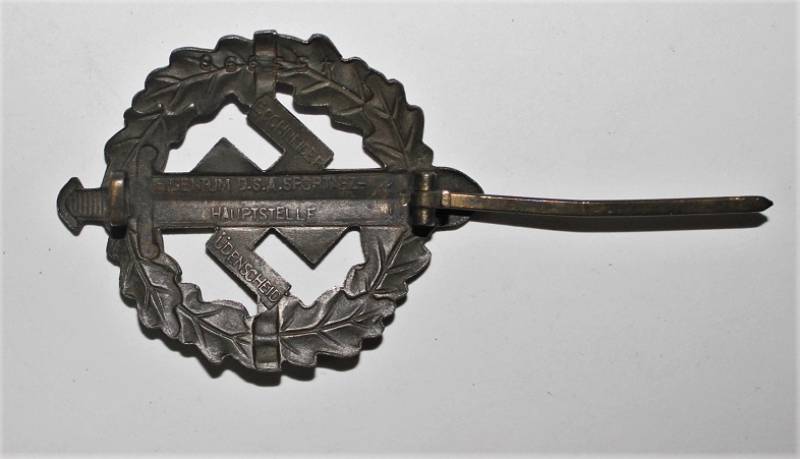 Distintivo meriti sportivi delle SA in bronzo, buone condizioni, patinato dal tempo e dallŽuso, marcato su retro. Originale 100% WWII periodo.
