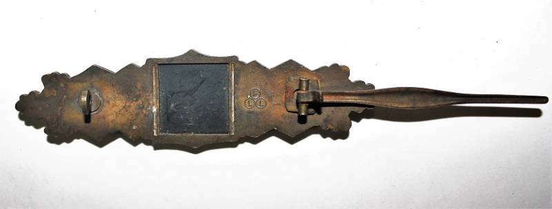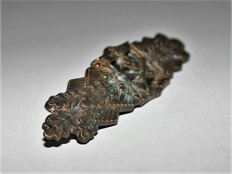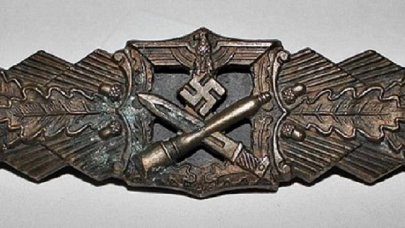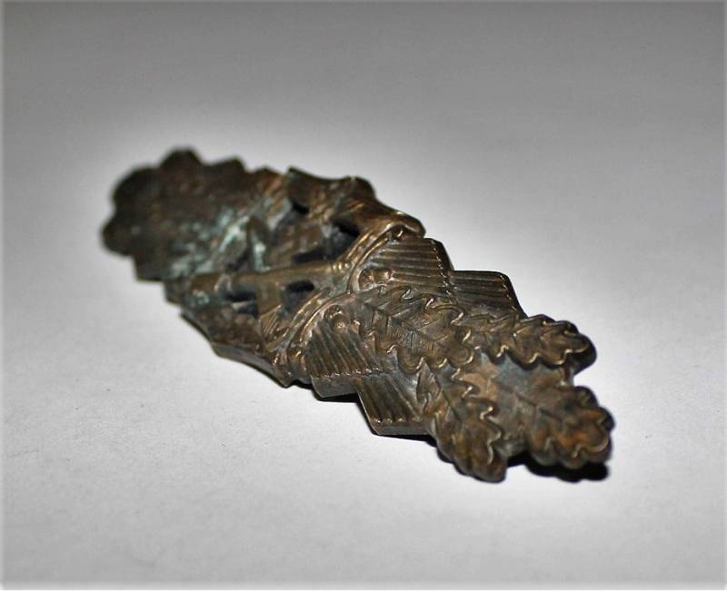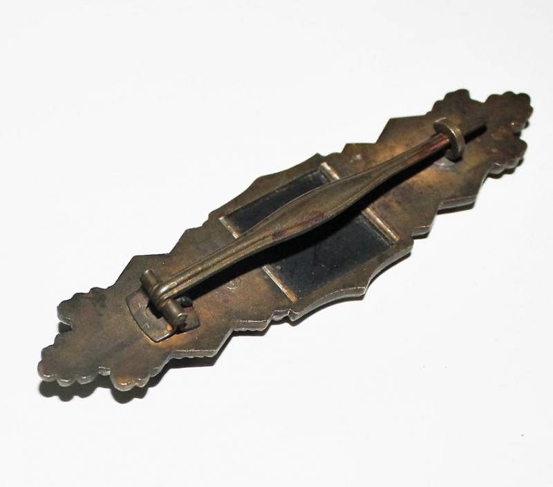 Distintivo per combattimento ravvicinato classe in bronzo "NAHKAMPFSPANGHE", condizioni molto belle, leggera patina del tempo e dellŽuso, ottimi dettagli, marcato sul retro con codice fabbricante. Originale 100% WWII periodo.