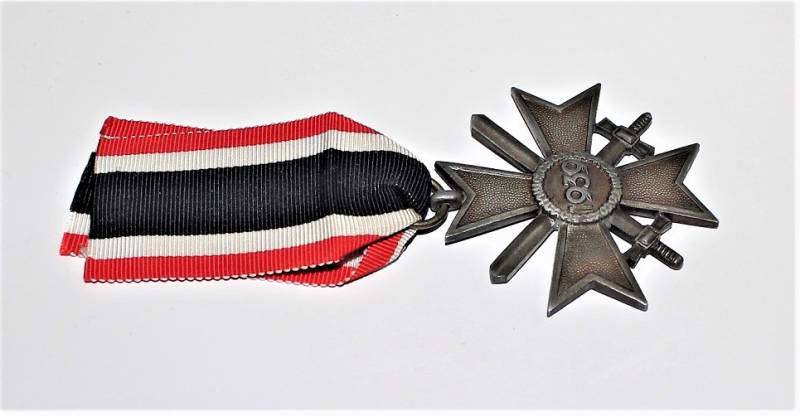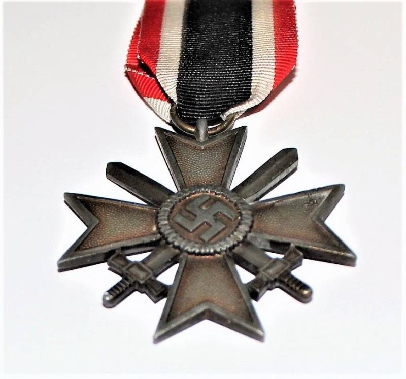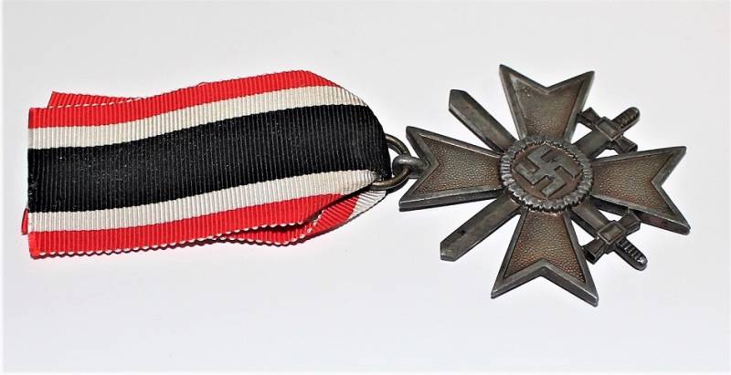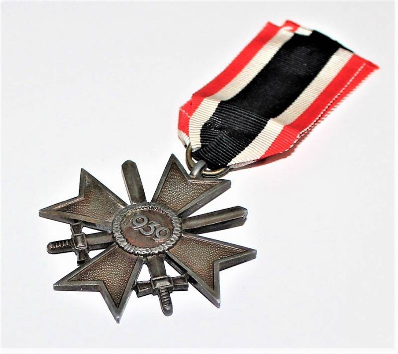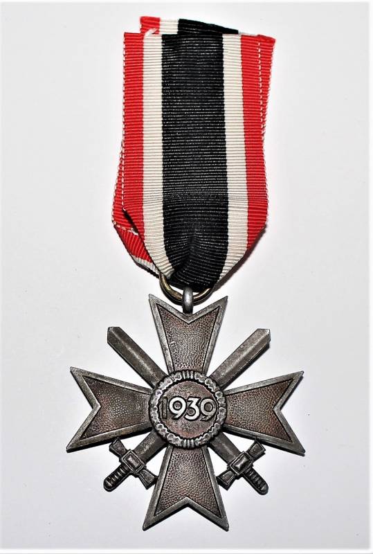 Medaglia meriti di guerra con spade grado in bronzo, completa di nastrino, con patina del tempo ma in buone condizioni, anello marcato con numero 45 riferito al fabbricante. Originale 100% WWII periodo.