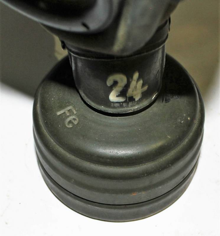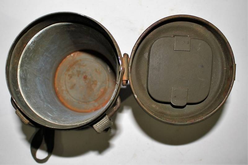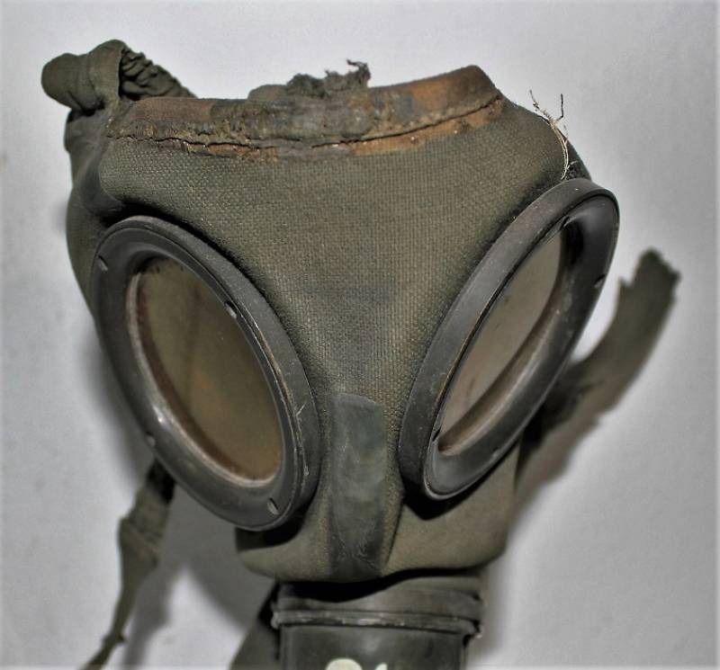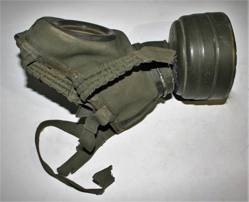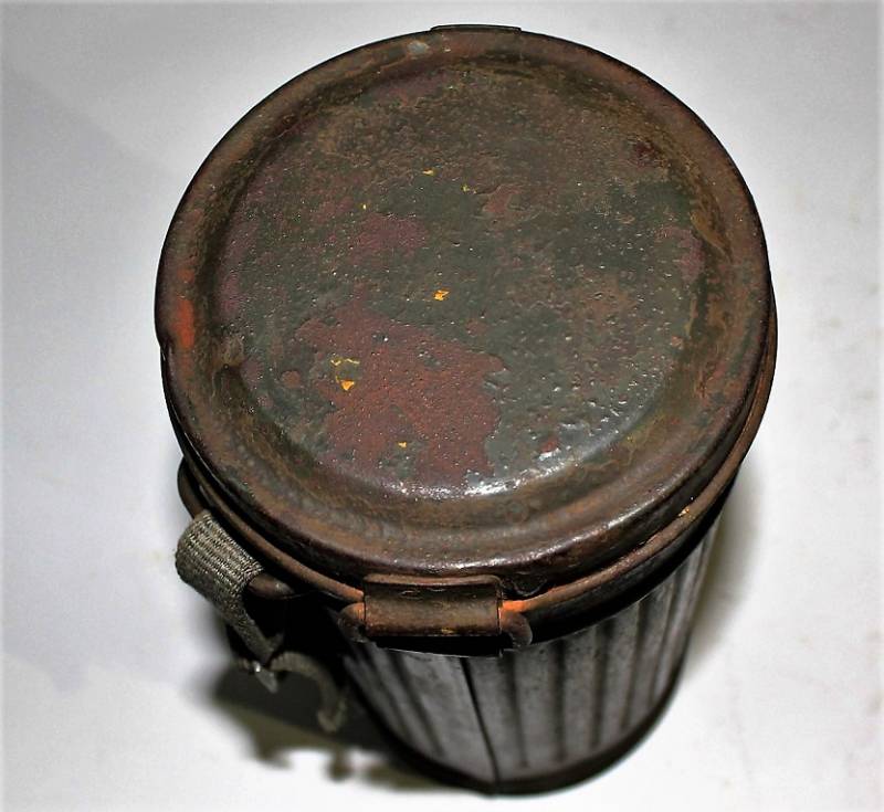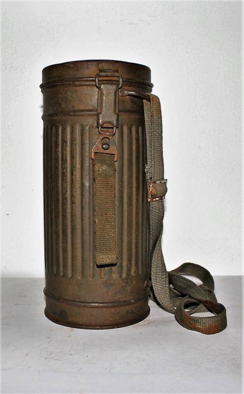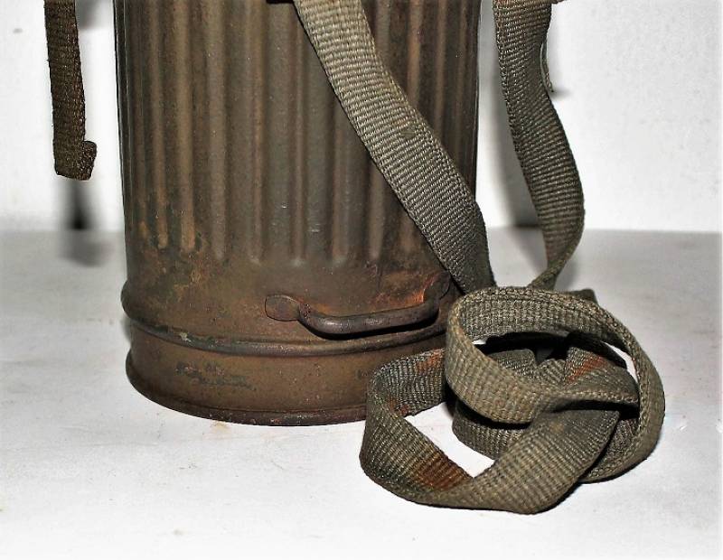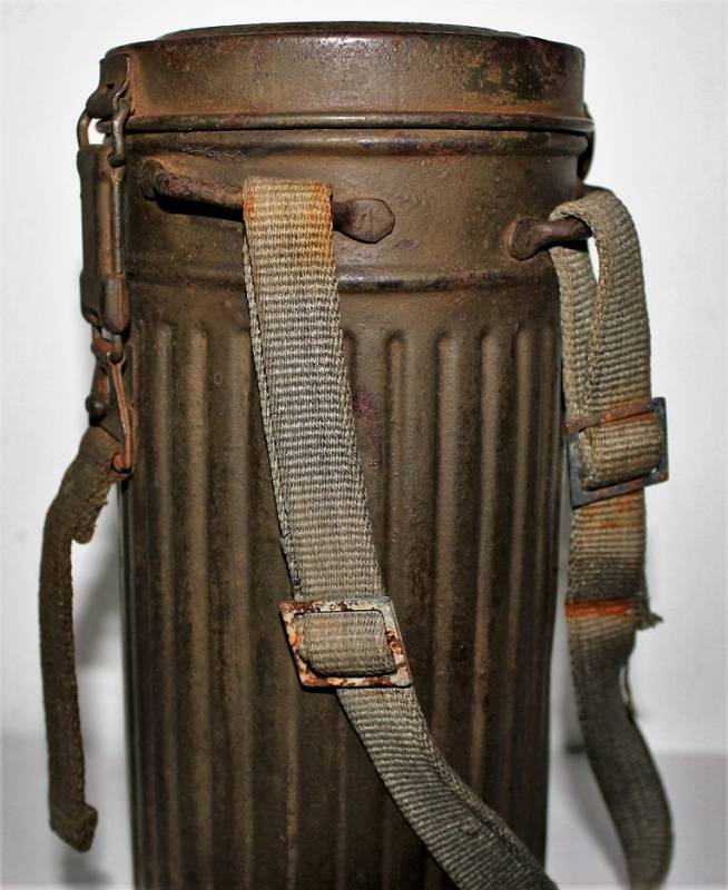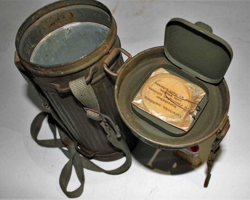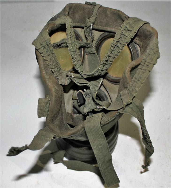 Maschera antigas completa in tutte le sue parti, compreso il cinghiaggio in tela, mancante della cinghia corta, con lenti di ricambio, in colorazione giallo tropicale DAK continentale al 60%, ma il colore è molto sbiadito, quasi verde, si vedono tracce del giallo originario, con patina del tempo e dellŽuso. Originale 100% WWII periodo.