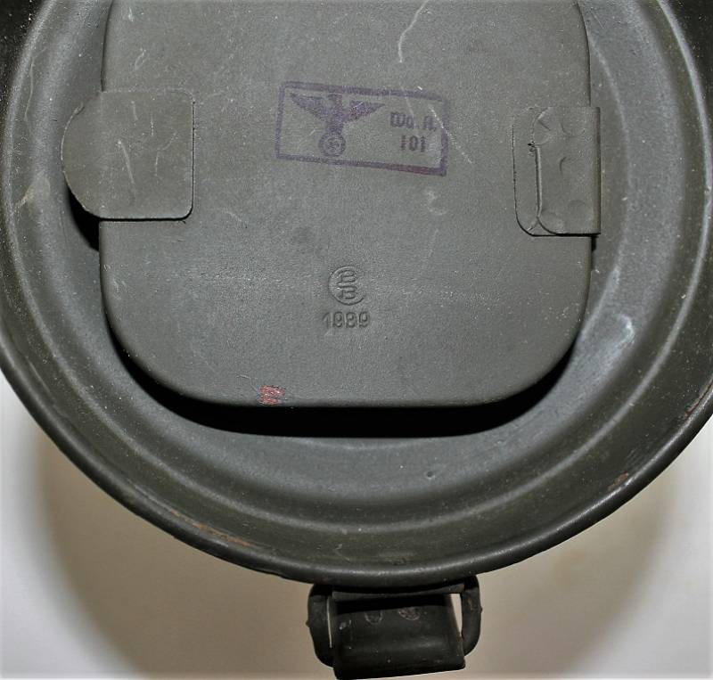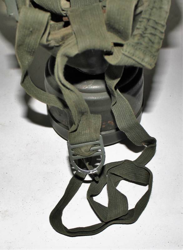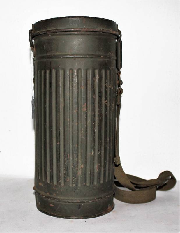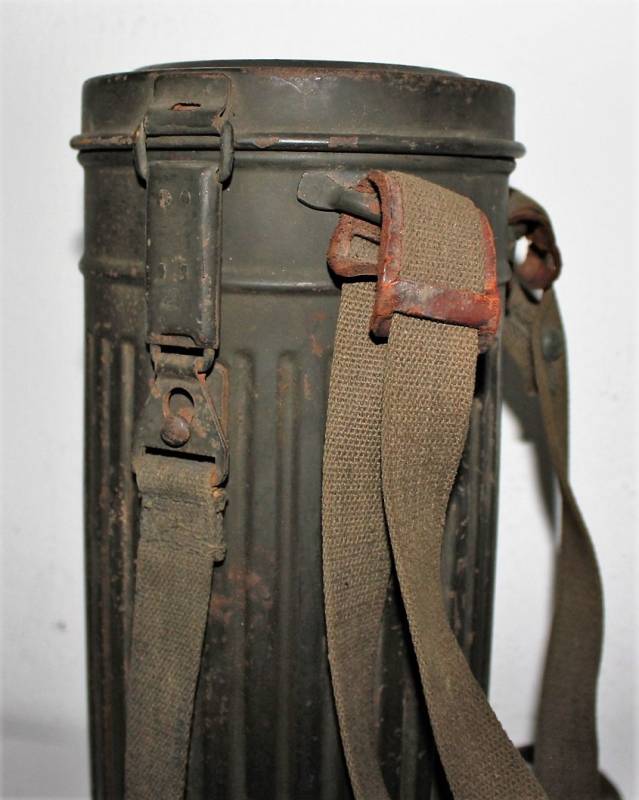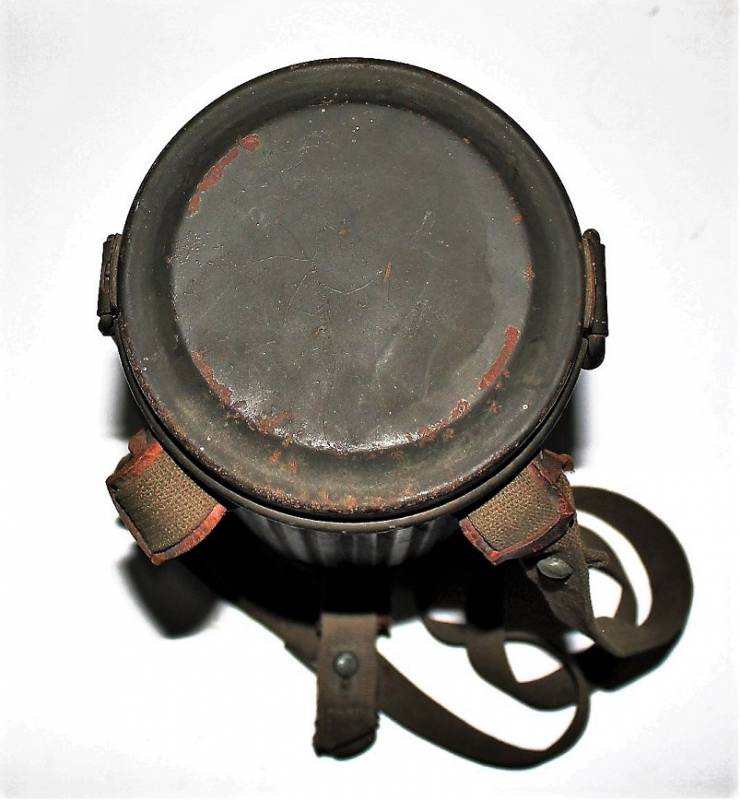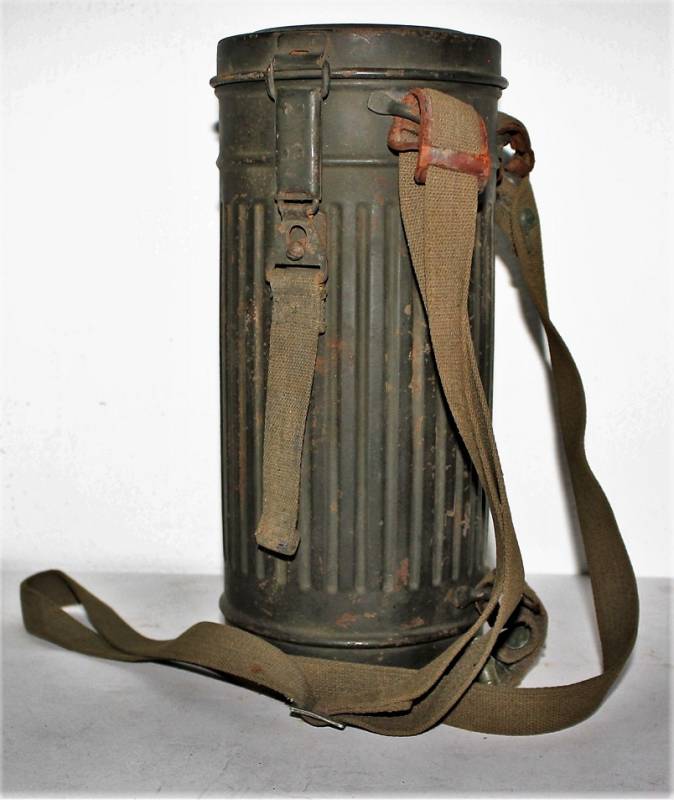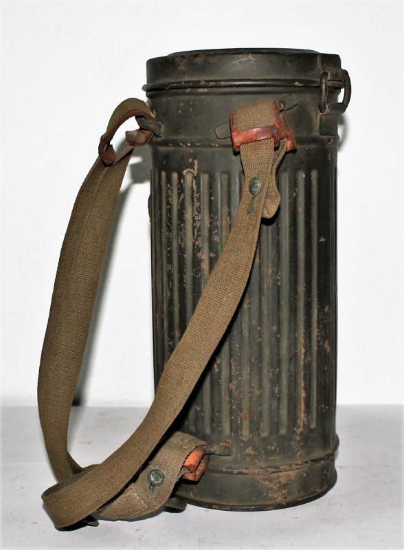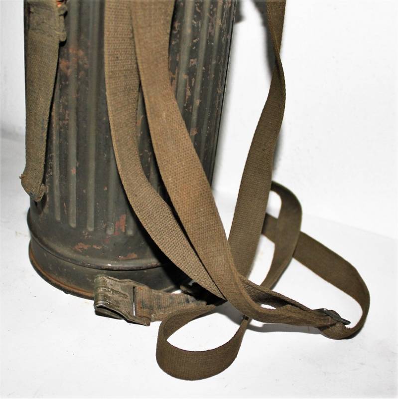 Maschera antigas nata in colorazione verde scuro allŽ80%, in ottime condizioni, con leggeri segni del tempo e dellŽuso, completa in tutte le sue parti, compreso cinghiaggio in canapa di 1°tipo, con rinforzi in pelle, lenti di ricambio, molla e straccio. Marcata internamente con la sigla del fabbricante e waffenamte molto ben leggibile, sul fondo del contenitore numero di matricola del soldato scritto a vernice, come sulla maschera. Originale 100% WWII periodo.