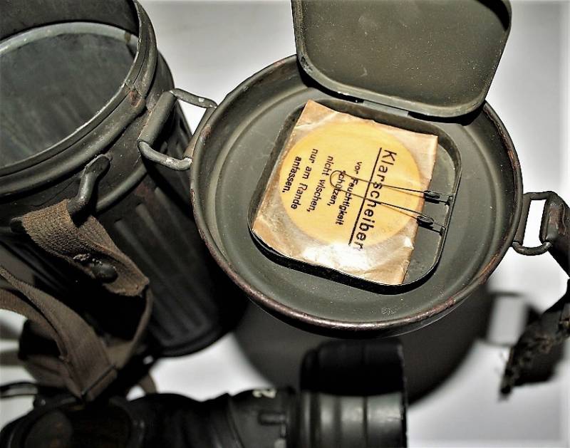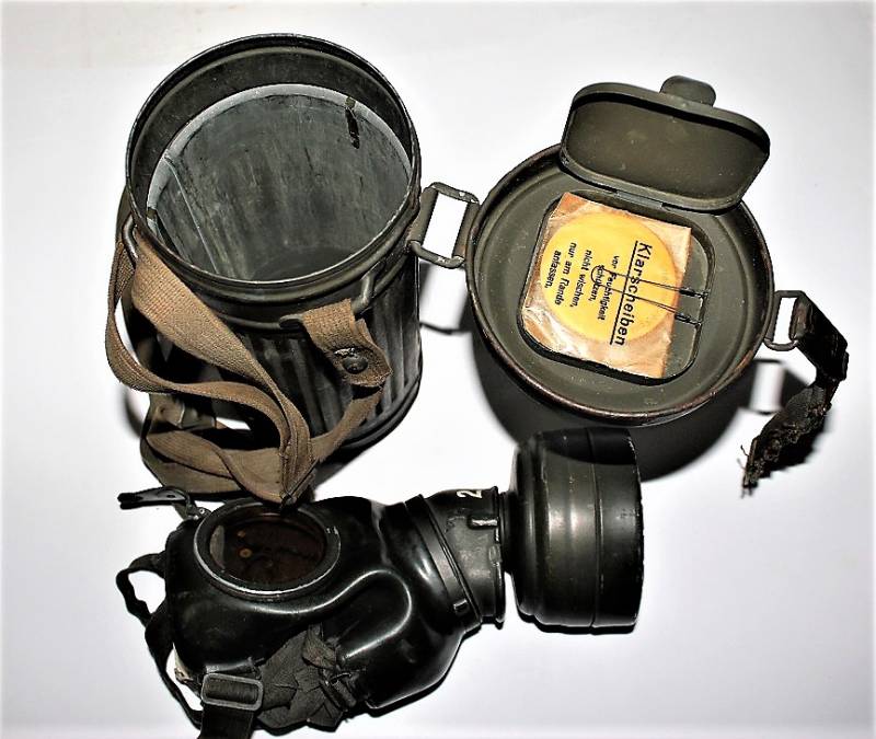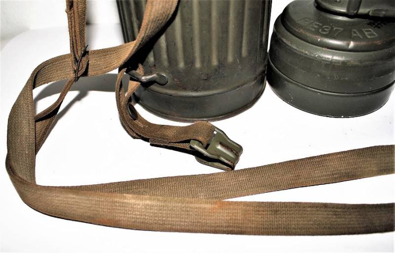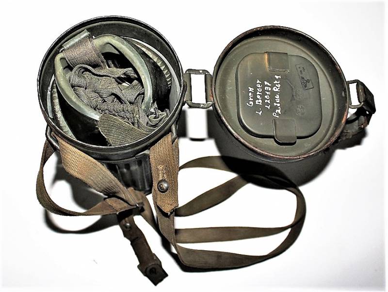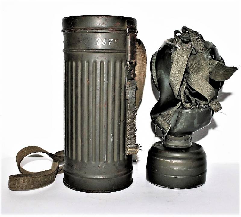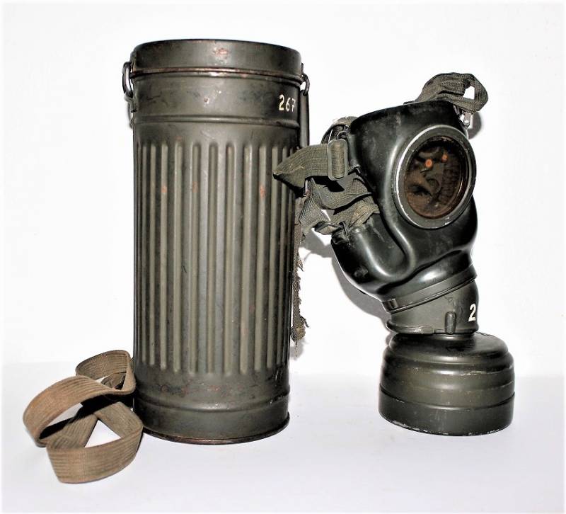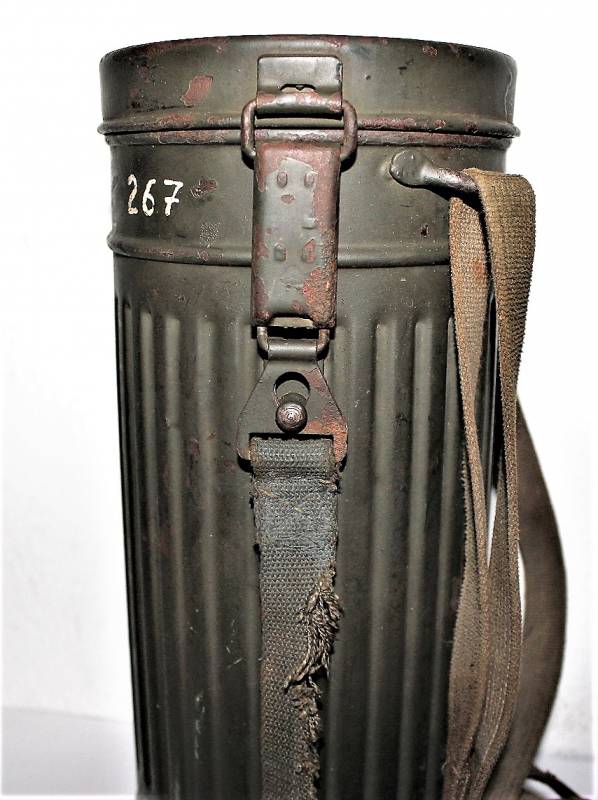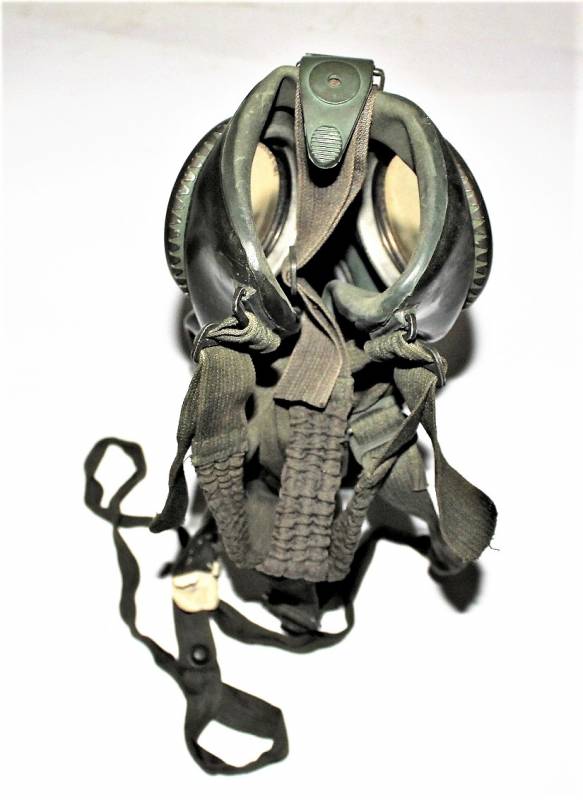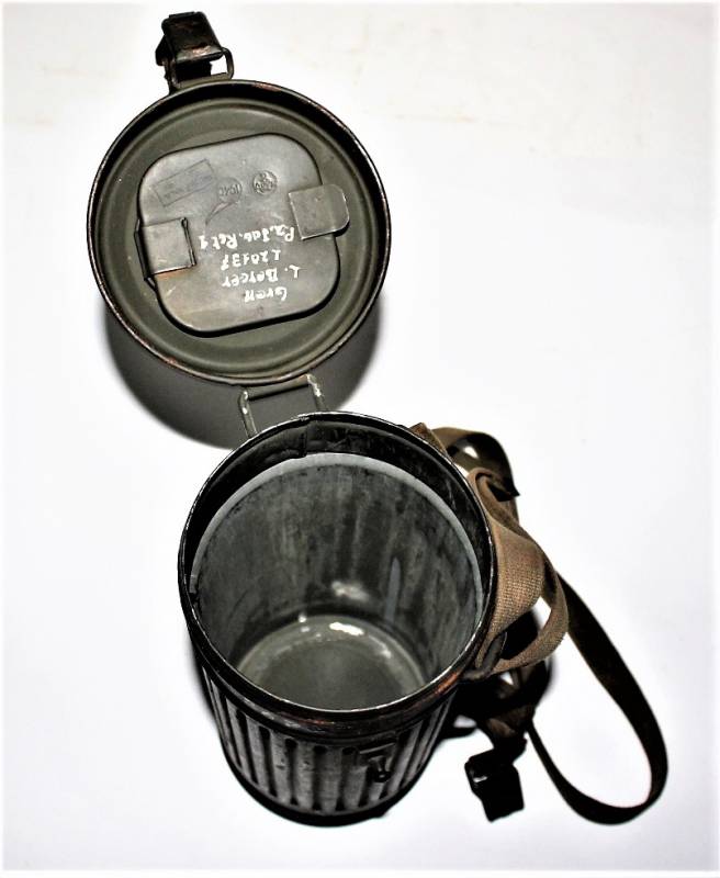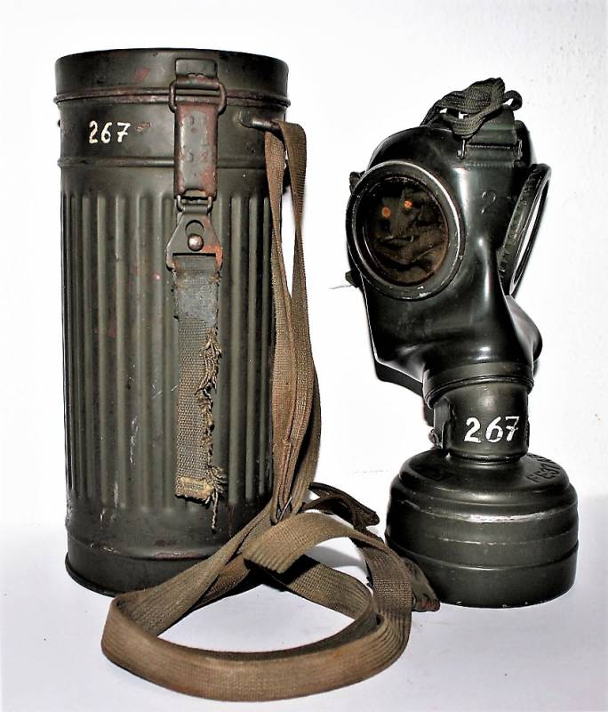 Maschera anti-gas in colorazione verde al 90%, ottime condizioni, completa in ogni sua parte compreso il cinghiaggio e lenti di ricambio, non restaurata o riparata, nome e reparto del soldato scritto a vernice allŽinterno, maschera e contenitore stesso numero (267). Originale 100% WWII periodo.