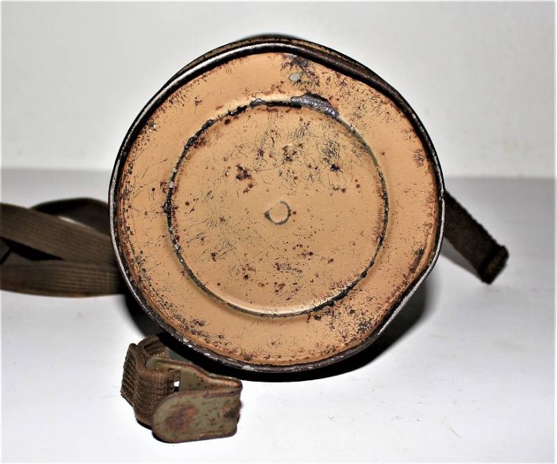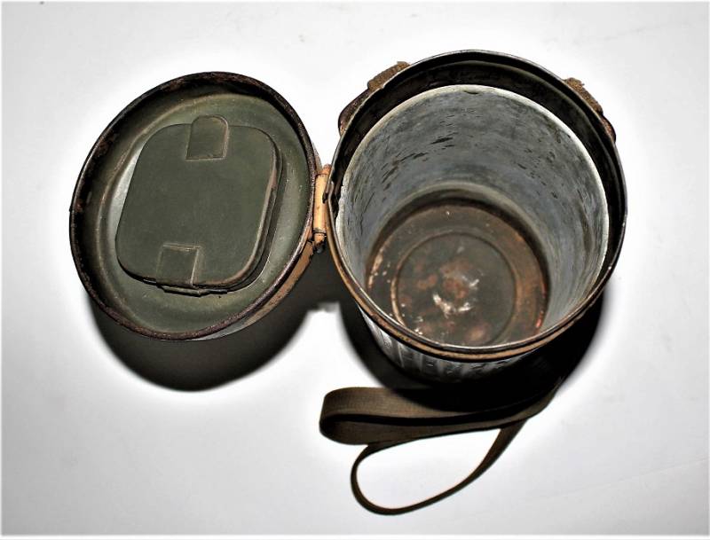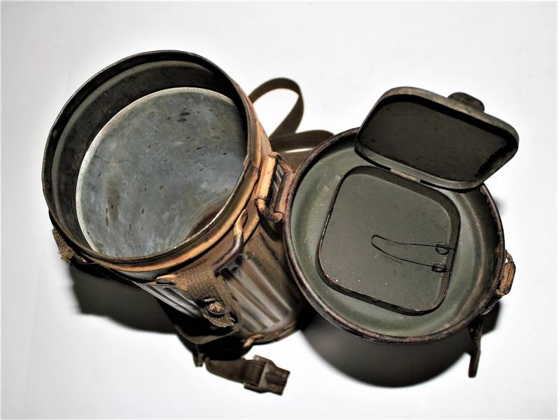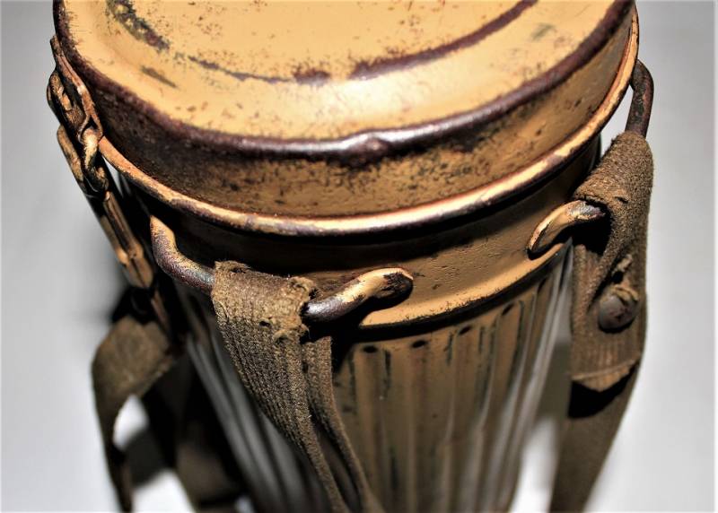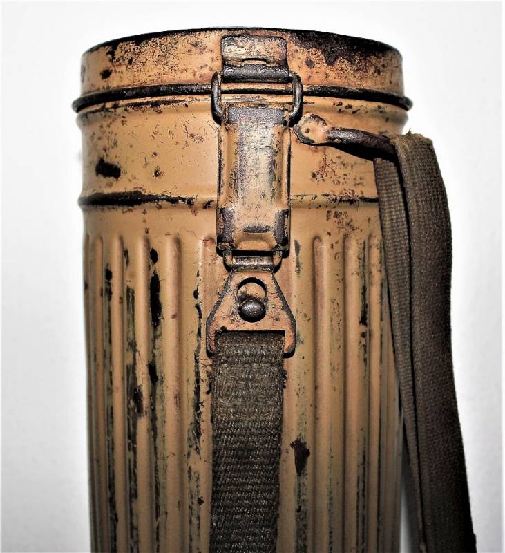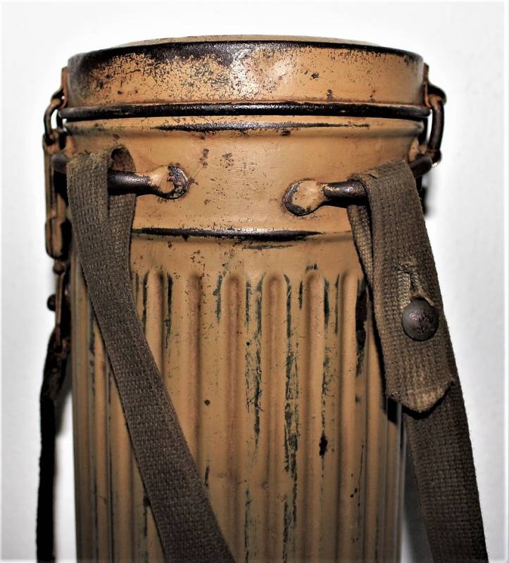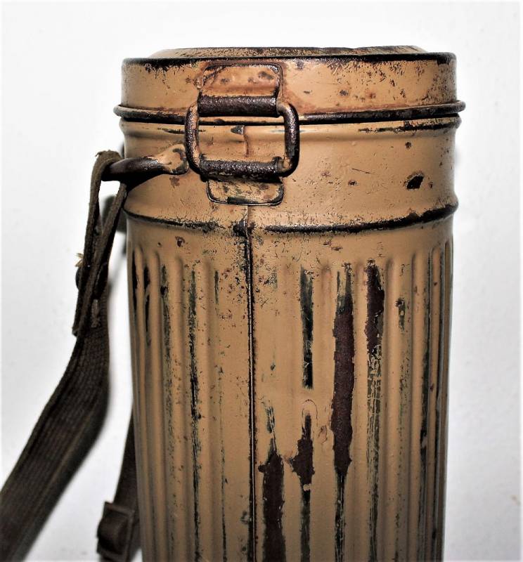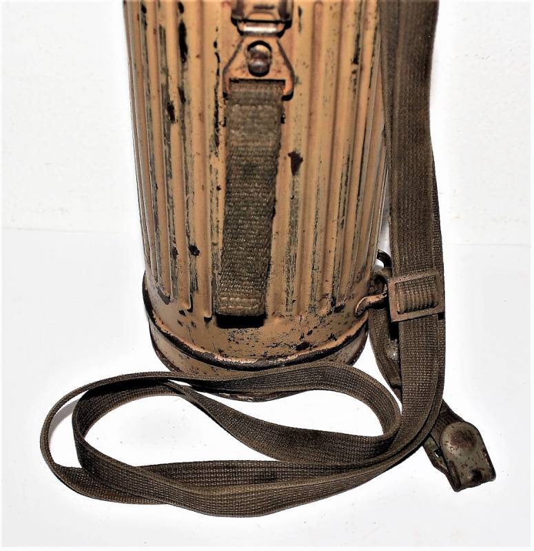 Contenitore maschera antigas completo del suo cinghiaggio in colorazione giallo tropicale D.A.K. continentale allŽ80% circa, con patina del tempo e dellŽuso, non restaurato o riparato, si intravede internamente la marcatura del fabbricante. Originale 100% WWII periodo.