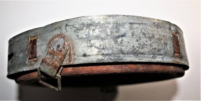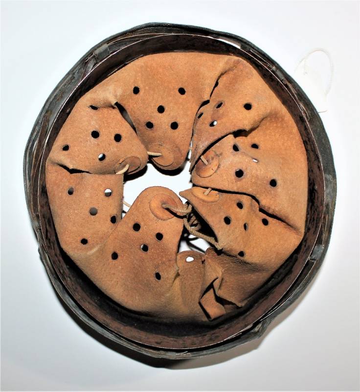 Bella riproduzione di liner per elmetto. Cerchione originale marcato con taglia ferro 64 e nome del fabbricante con data, pelle e controcerchione riprodotti, taglia pelle 56-57.