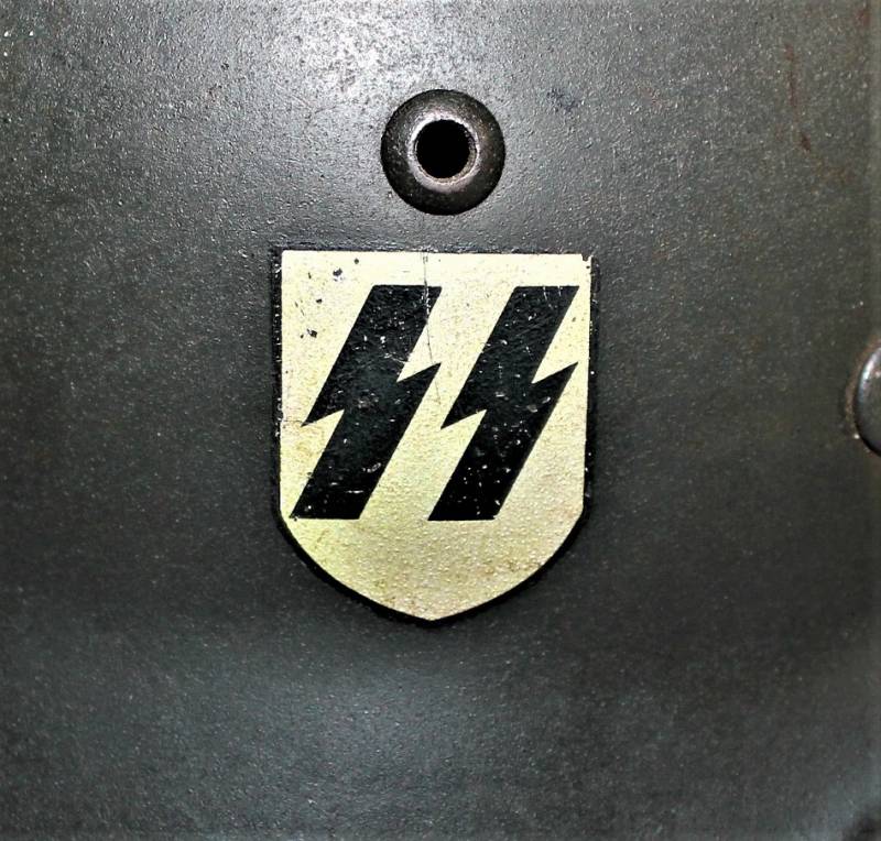 Stupendo elmetto M35 W.SS doppia decalcomania in condizioni perfette, completo in ogni sua parte, non restaurato o riparato, solo con leggera patina del tempo e dell´uso, nato in verniciatura grigio-verde quasi al 100%, decalcomanie leggermente patinate, ma anch´esse quasi al 100%, interno e sottogola mai smontati, sottogola marcato con fabbricante e data 1939, marcato sul ferro con timbro ovale del fabbricante e data 1939, ferro marcato con numero di lotto, sigla fabbricante SE64, taglia pelle 56. Originale 100% WWII periodo e molto raro.