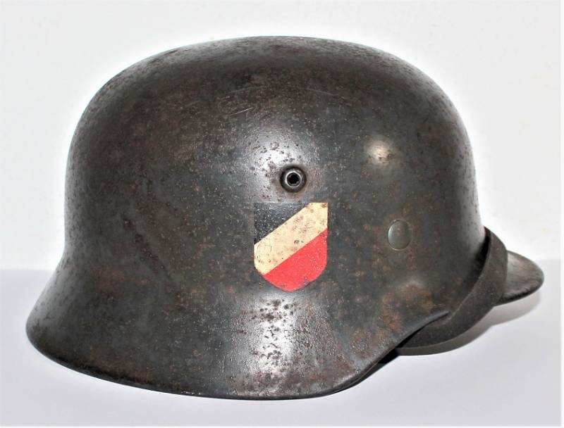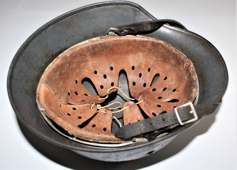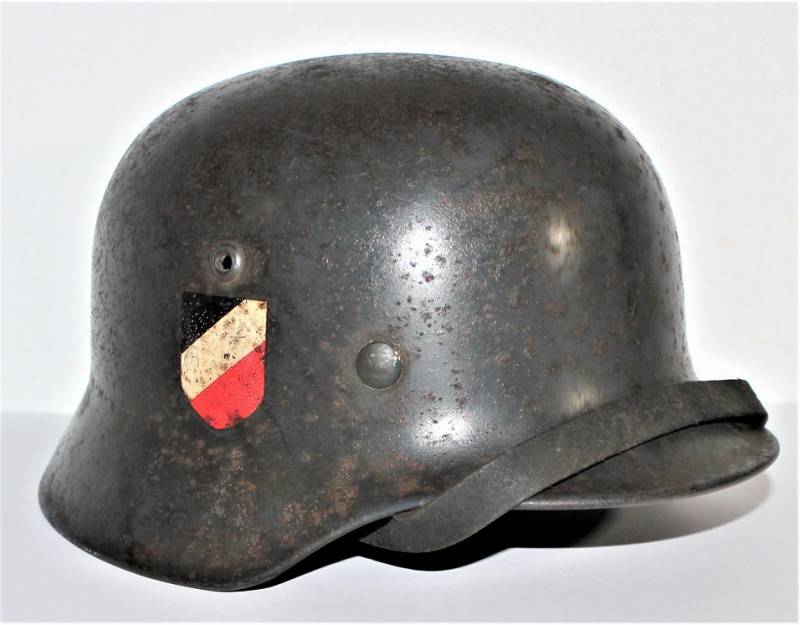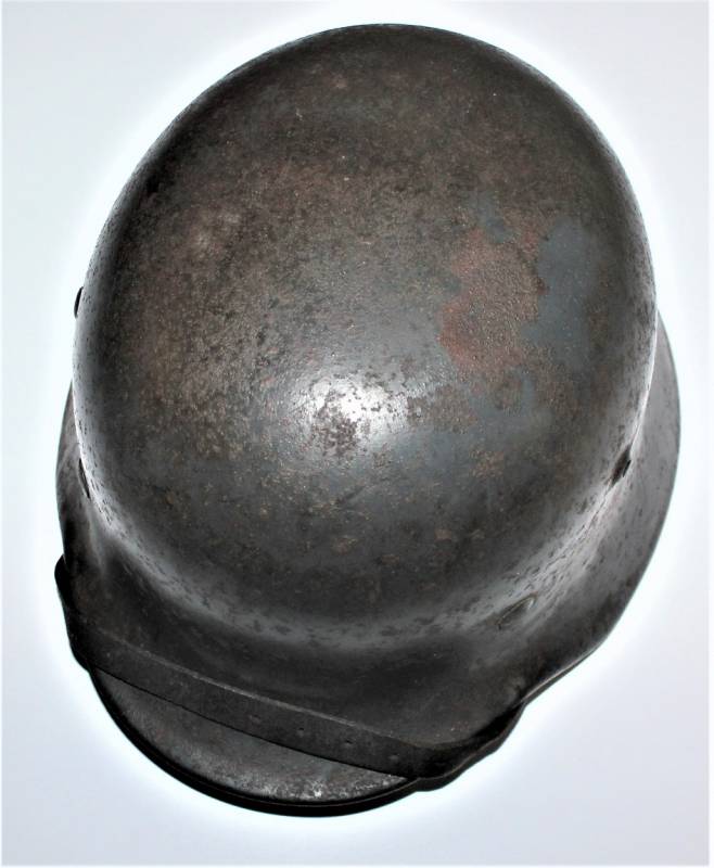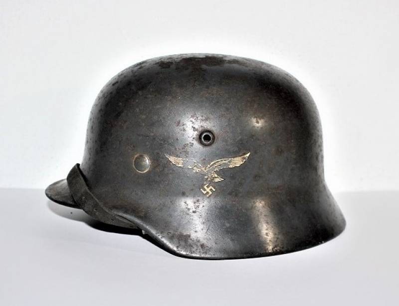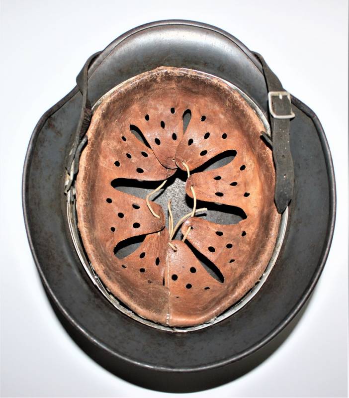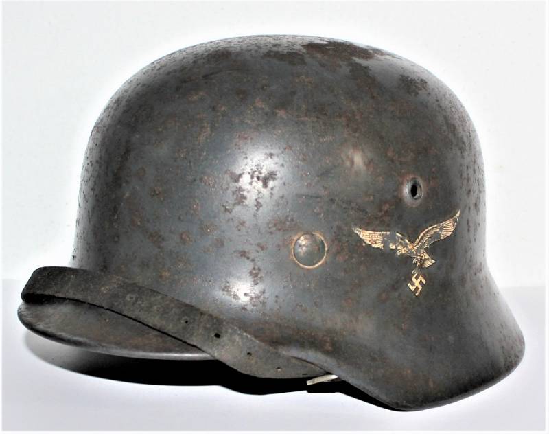 Elmetto M35 della LW bidekal nato in colorazione blu Luftwaffe in buone condizioni, non restaurato o riparato e mai smontato, completo in ogni sua parte, solo patina del tempo e dellŽuso, qualche traccia di ruggine, colore al 70/80%, decalcomanie patinate, aquila allŽ80% e scudetto colori nazionali al 90%, pelle in ottime condizioni non lesionata ancora morbida, marcato sul ferro con codice fabbricante Q64 e numero di lotto, pelle taglia 56-57, sul sottogola sŽintravede il marchio del fabbricante e la data, iniziali del nome del soldato sulla pelle. Originale 100% WWII periodo.