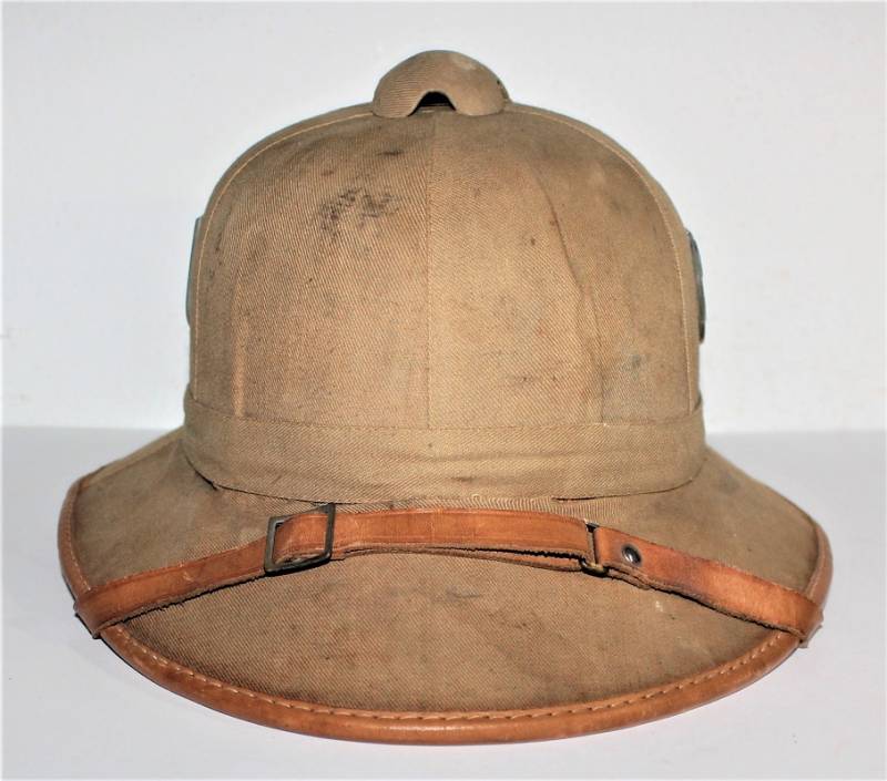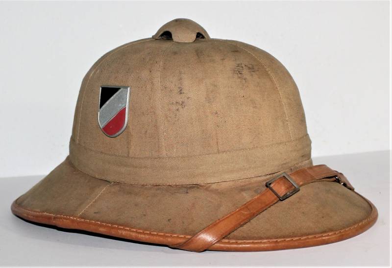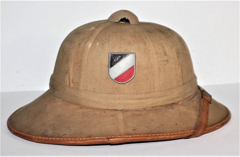 Casco coloniale DAK della WH in belle condizioni, appena portato, con leggeri segni del tempo e dellŽuso, completo e integro in tutte le sue parti, nato in tela di cotone giallo, fregi mai rimossi. Non schiacciato o deformato. Taglia 55. Originale 100% WWII periodo.