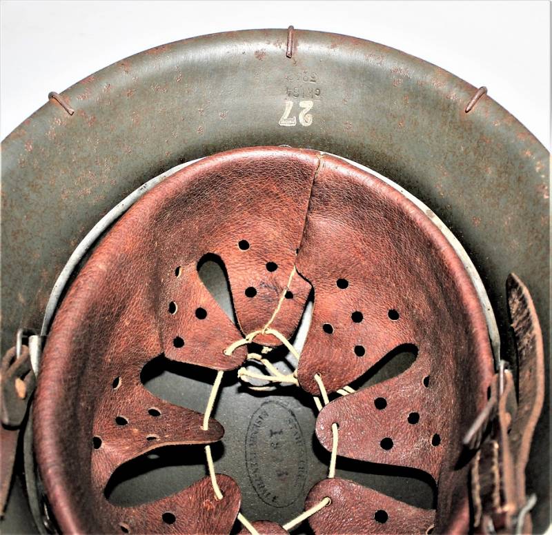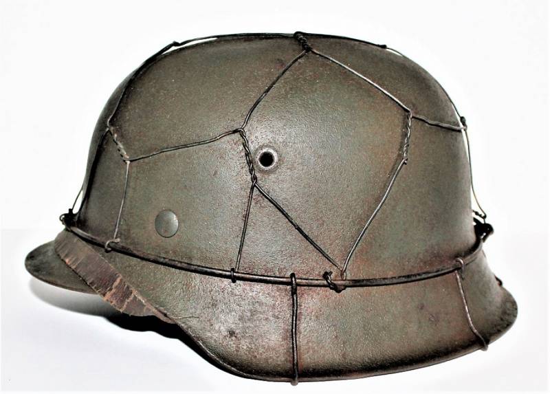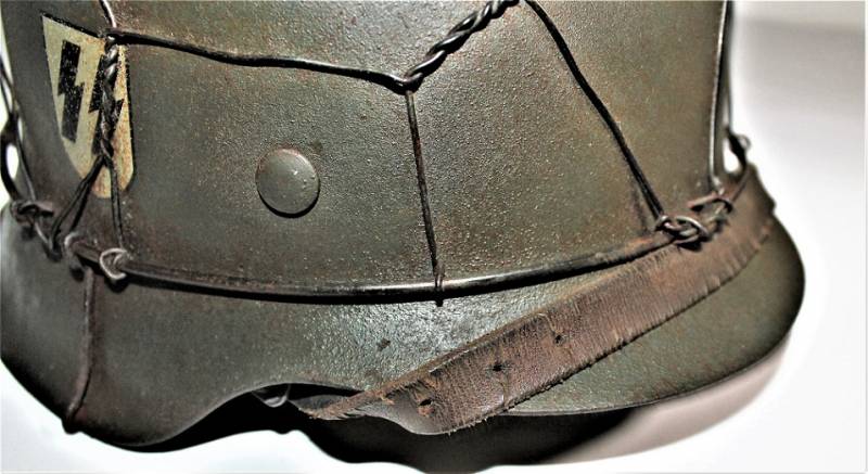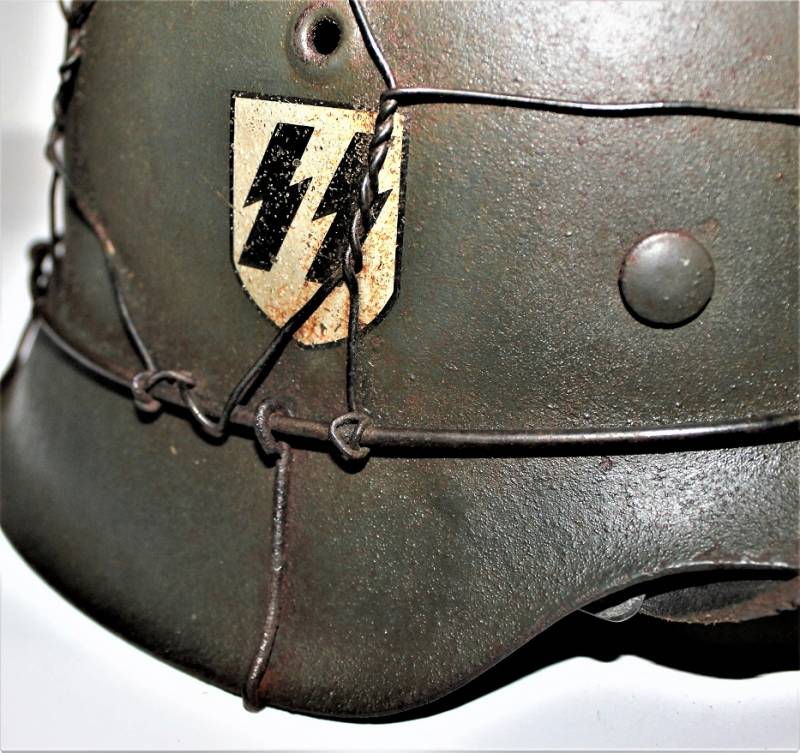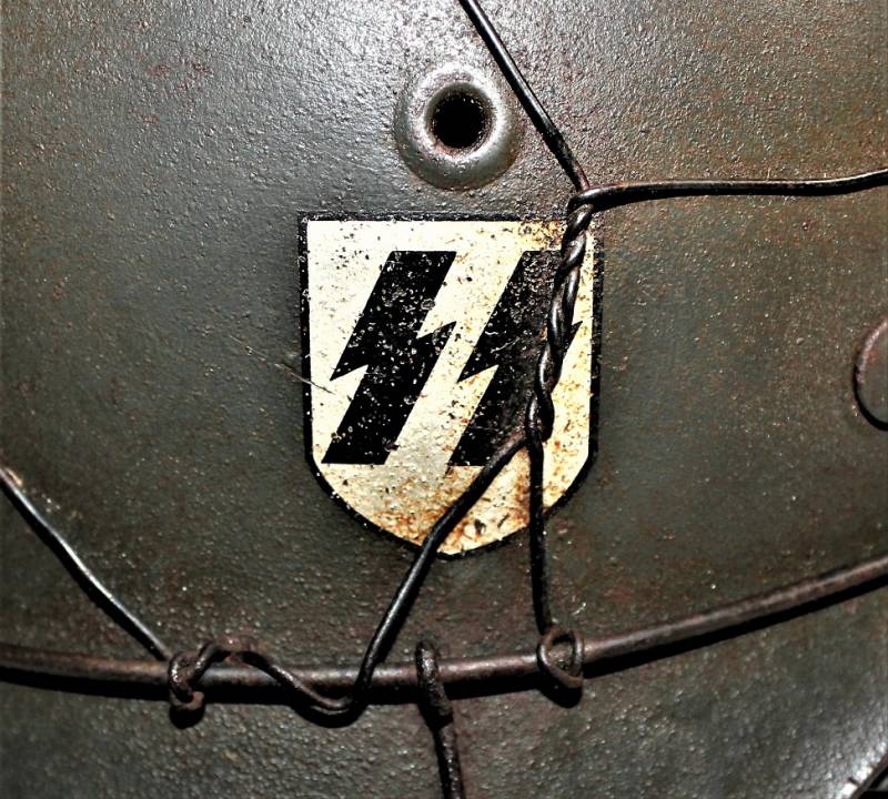 Bellissimo e raro elmetto M42 W.SS con rete, condizioni ottime con solo leggera patina del tempo e dellŽuso, completo in ogni sua parte non restaurato o riparato e mai smontato, nato in colorazione feldgrau rugosa al 90%, decalcomania con rune di 1°tipo anchŽesse al 90% e patinate, interno e sottogola mai smontati, ferro marcato con codice fabbricante, taglia 64 e numero di lotto, taglia pelle circa 56-57, sottogola marcato con nome fabbricante e data 1942, allŽinterno sulla calotta è ben visibile il timbro ovale dŽaccettazione del fabbricante e data 1942. Originale 100% WWII periodo. PREZZO SU RICHIESTA!!!!