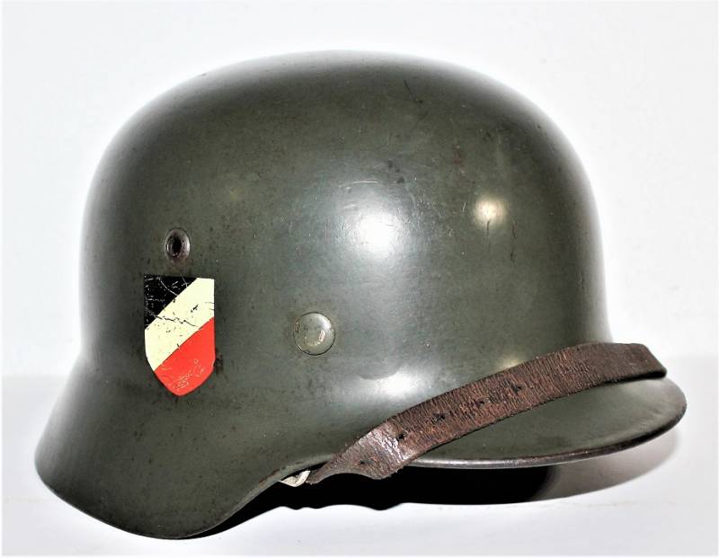 BellŽelmetto M35 bifregio della WH nato in colorazione verde mela 1° tipo allŽ85% in buone condizioni solo con leggera patina del tempo e dellŽuso, non restaurato o riparato, completo in ogni sua parte, interno e sottogola mai smontati, pelle in ottime condizioni e non lesionata solo patinata dallŽuso, sottogola marcatato con codice fabbricante e data 1939, decalcomanie in buone condizioni, aquila quasi al 100% e tricolore al 90% anchŽesse con patina del tempo.