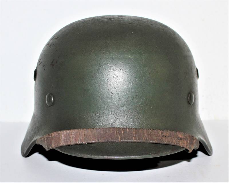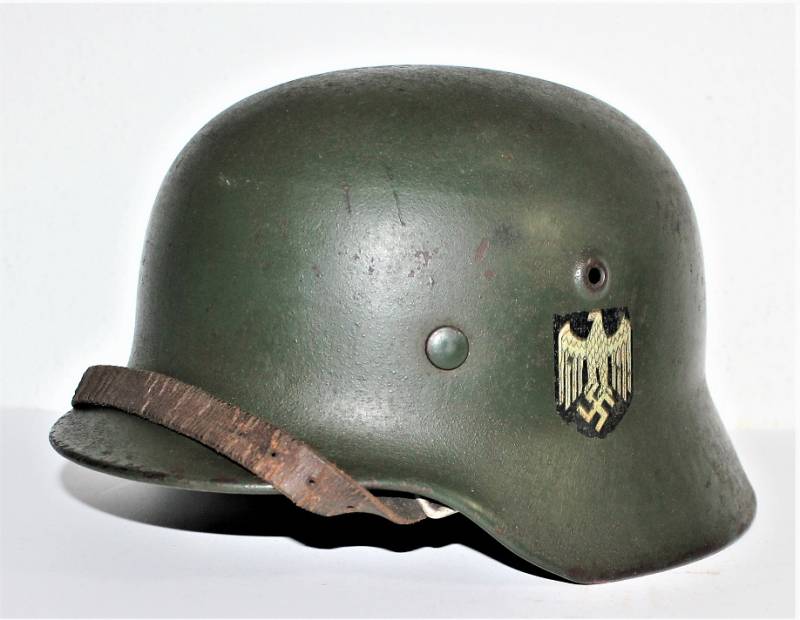 Elmetto M40 della WH monodekal in buone condizioni, nato in colorazione feldgrau rugoso scuro al 90%, non restaurato o riparato e mai smontato, completo in ogni sua parte, solo con patina del tempo e dellŽuso, decalcomania al 95%, pelle in buone condizioni non lesionata, marcato sul ferro con codice fabbricante SE64 e numero di lotto, pelle taglia 57, sottogola marcato con sigla del fabbricante e data 1940.
