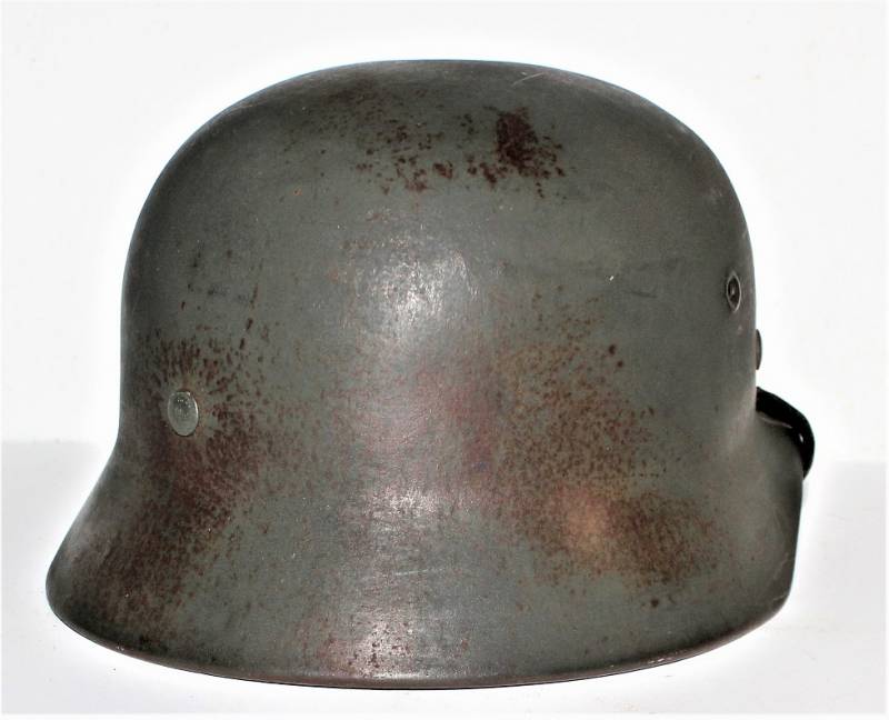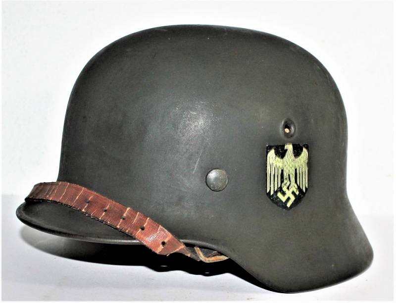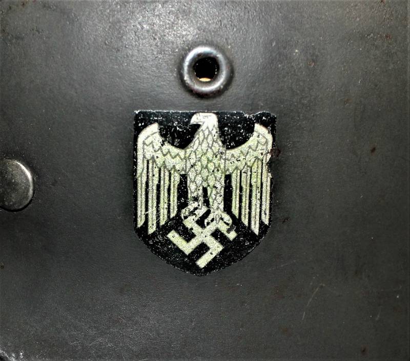 Elmetto M40 monofregio della WH nato in colorazione verde feldgrau scuro rugoso anti-riflesso con vernice al 95%, ottime condizioni con leggera patina del tempo e dellŽuso, non restaurato o riparato, completo in ogni sua parte, sul lato sinistro macchiato superficialmente di ruggine ma non camolato, interno e sottogola mai smontati, pelle in ottime condizioni non lesionata solo patinata dallŽuso, sul sottogola sŽintravede il nome del fabbricante e la data 1940, decalcomania in ottime condizioni quasi al 100%.
