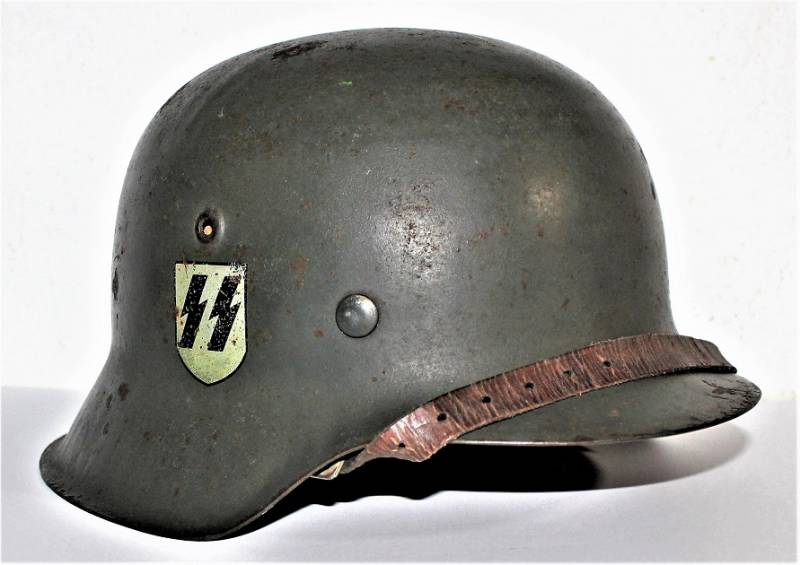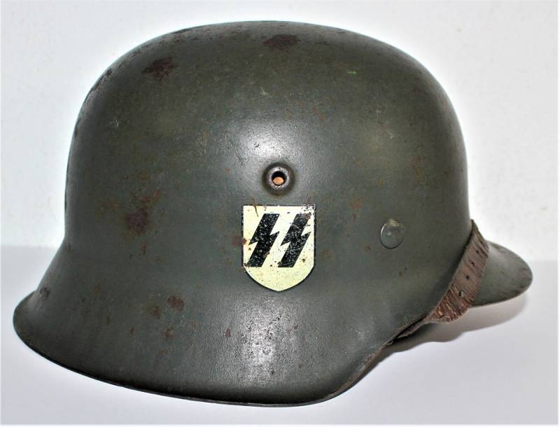Bellissimo elmetto M42 monofregio W.SS nato in colorazione verde feldgrau scuro leggermente rugoso con vernice al 90%, ottime condizioni con leggera patina del tempo e dellŽuso, non restaurato o riparato, completo in ogni sua parte, interno e sottogola mai smontati, pelle in ottime condizioni non lesionata solo patinata dallŽuso, sottogola marcato con codice fabbricante e data 1942, decalcomania di 1° tipo in ottime condizioni al 95% solo patinata dal tempo.
