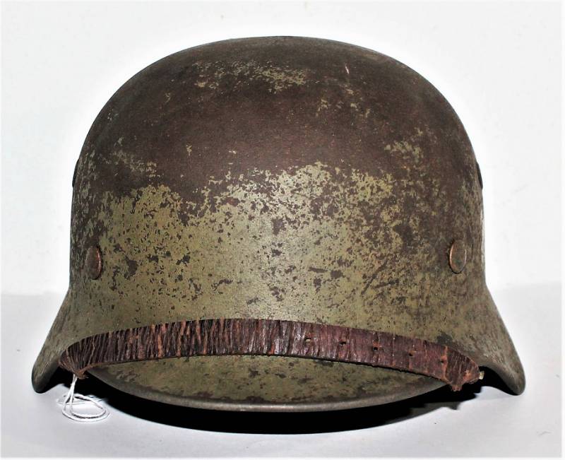 Elmetto M40 mono fregio della WH in condizioni buone ma molto usato con tracce di ruggine ma superficiali, nato in verniciatura verde chiaro 1°tipo al 50%, decalcomania molto vissuta ma al 90%, completo in ogni sua parte, interno e sottogola mai smontati, la pelle č vissuta ma in buone condizioni ma non lesionata, sottogola marcato con nome del fabbricante e data, ferro marcato con codice fabbricante e numeri di lotto, taglia ferro 64, taglia pelle 57.
