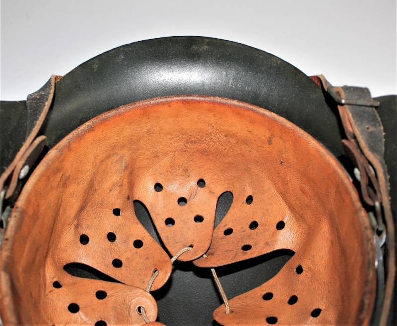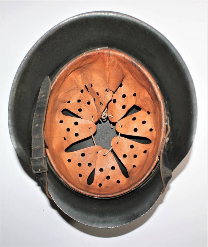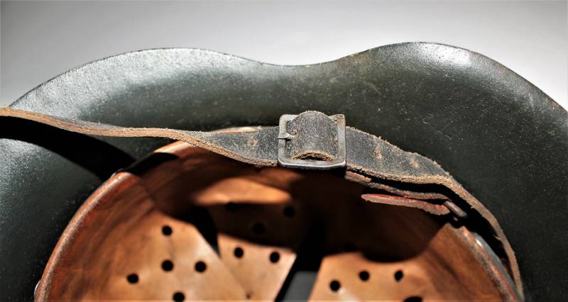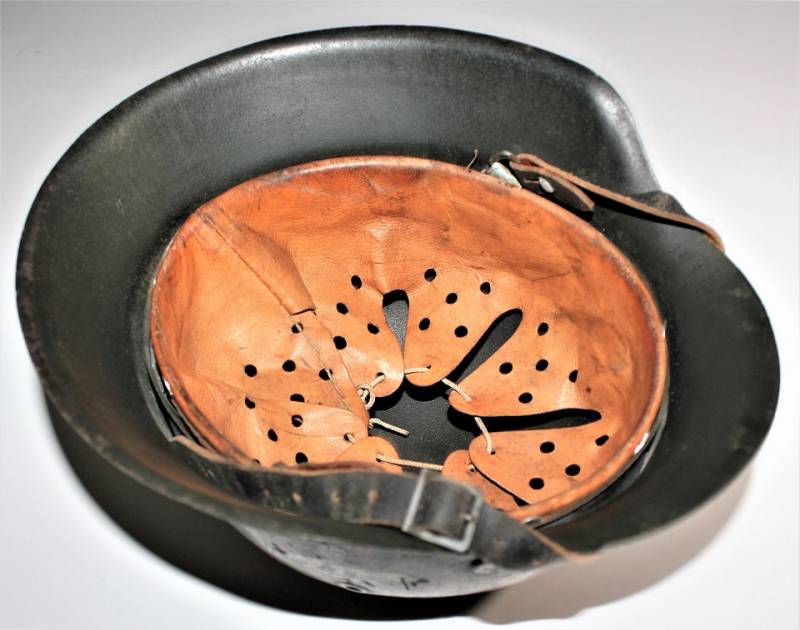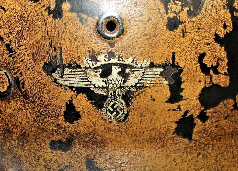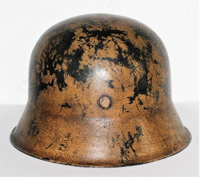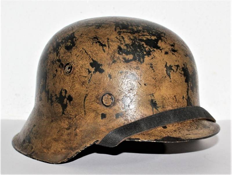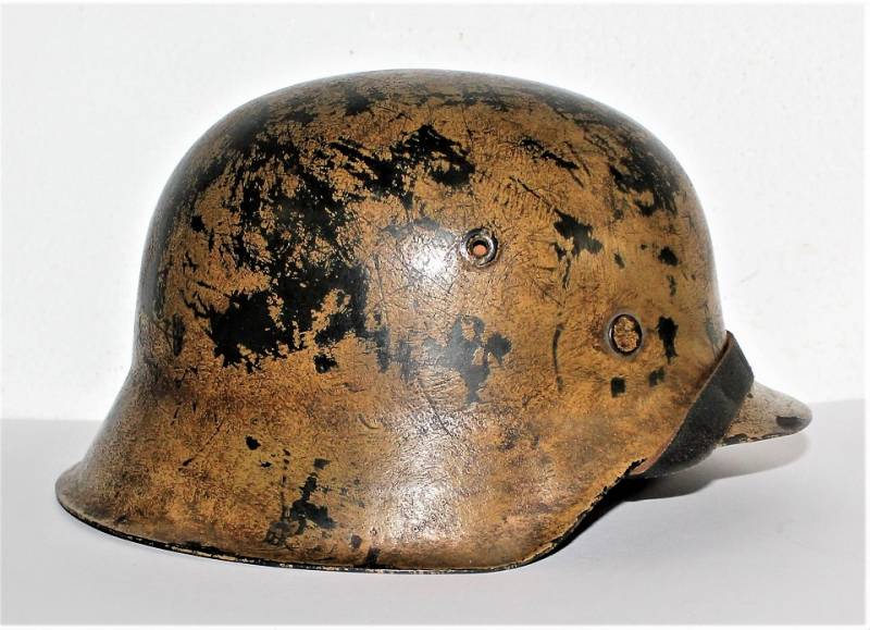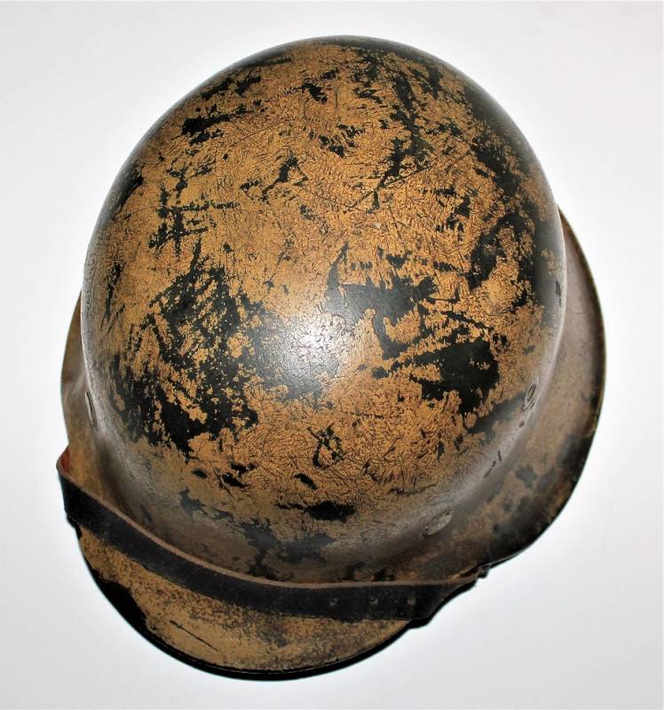 Raro elmetto mod.42 monodekal NSKK in colorazione mimetica giallo continentale, condizioni ottime, non restaurato o riparato e completo in ogni sua parte, verniciatura mimetica allī80%, decalcomania quasi al 100% solo patinata dal tempo, interno e sottogola mai smontati con pelle del liner in ottime condizioni e non lesionata, sottogola integro marcato con nome del fabbricante e data, ferro marcato con codice fabbricante ET62 e numeri di lotto, taglia pelle 55.