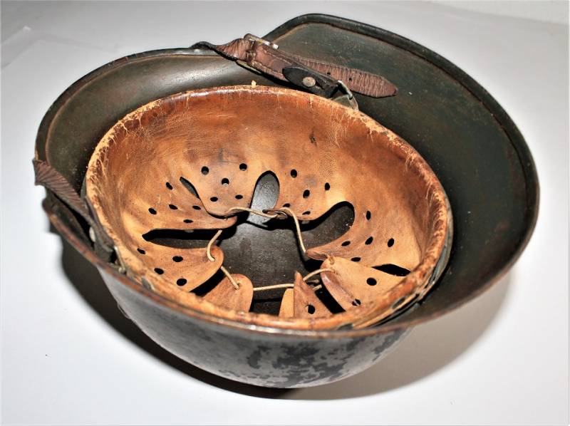 Elmetto mod.35 della WH in colorazione mimetica gialla DAK, continentale o fronte Italiano in buone condizioni, con patina del tempo e dellŽuso, ma fascinoso, non restaurato o riparato, colorazione mimetica al 60-70%, interno e sottogola mai smontati e pelle non danneggiata, sottogola marcato con sigla del fabbricante e data, ferro marcato con sigla del fabbricante e numero di lotto.