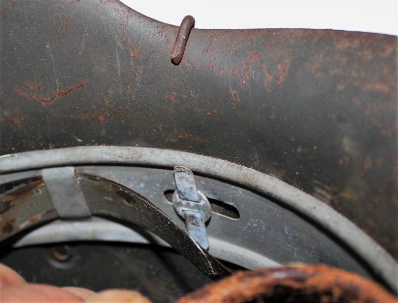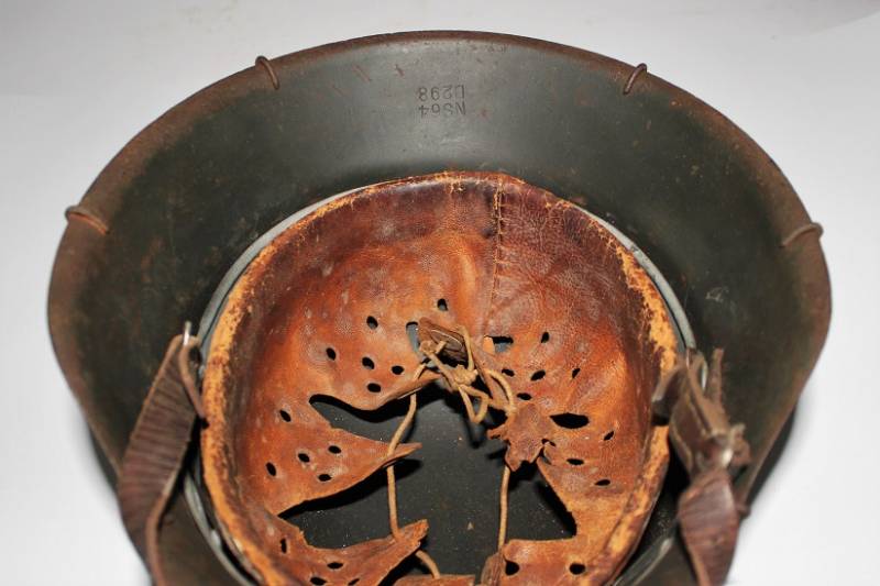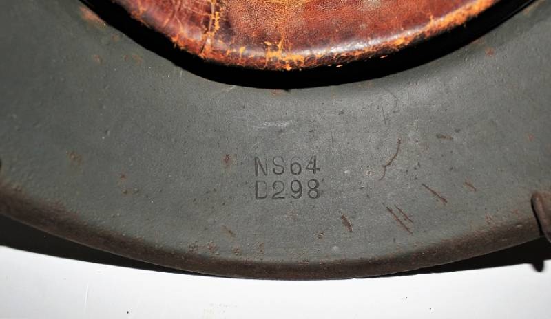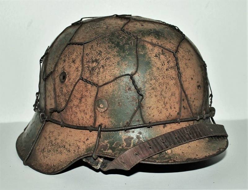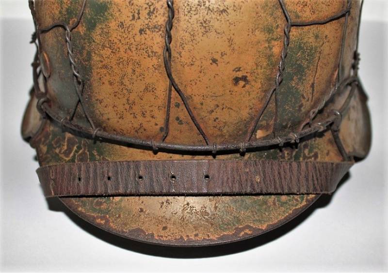 Elmetto mod.42 WH camouflage tipico fronte del Nord, due toni di colorazione camo giallo-verde allŽ80%, completo di "rete da polli", il tutto belle condizioni, con patina del tempo e dellŽuso, ma non restaurato o ritoccato, completo del suo interno e sottogola mai smontati, due lembi della pelle del liner sono lesionati (vedi foto). Ferro marcato con sigla del fabbricante e taglia NS64 e numero di lotto, sottogola con sigla del fabbricante e data 1943. Taglia pelle circa 57. Originale 100% WWII periodo.
