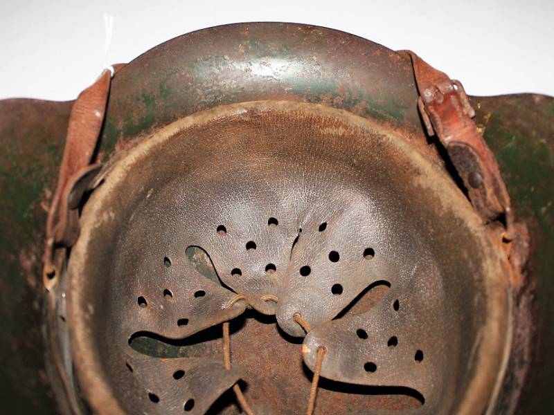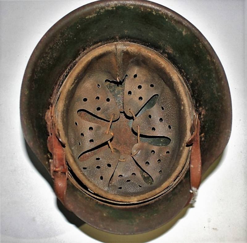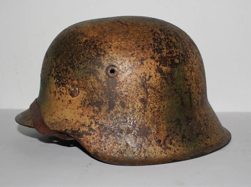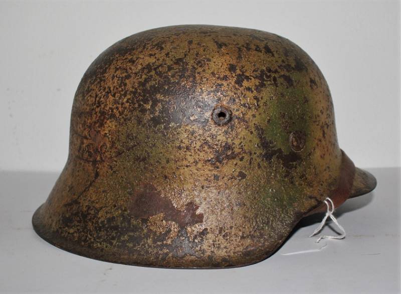 Elmetto mod.42 mimetico WH nato senza fregi completo in ogni sua parte, mai smontato, con patina del tempo e dellŽuso, mimetico 2 colori giallo con sfumature di verde, tipica colorazione fronte Nord Europa. Interno mai smontato, pelle del sottogola e dellŽinterno non lesionate vissute ma ancora buone, ferro marcato con numero di lotto, sigla del fabbricante, taglia ferro 62, taglia pelle 55-56. Originale 100% WWII periodo.