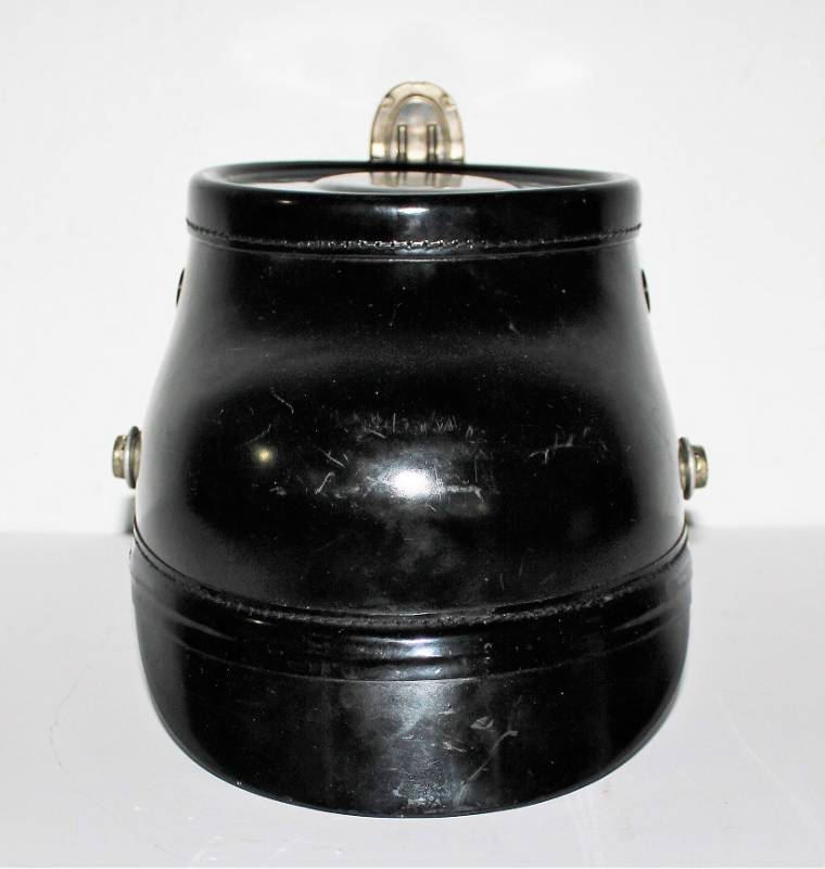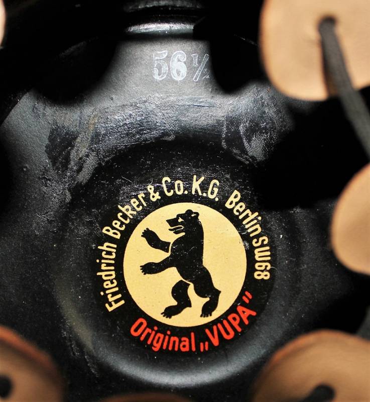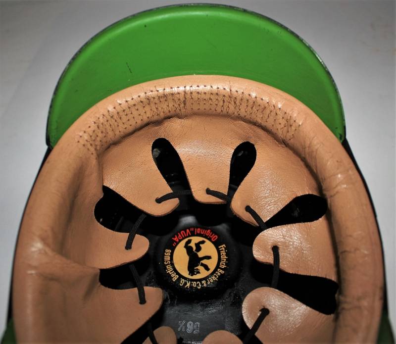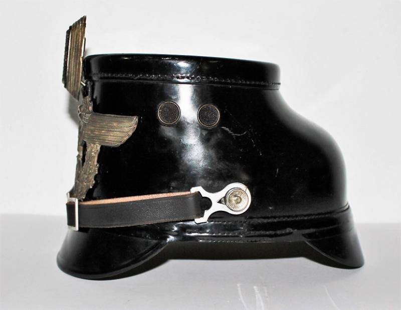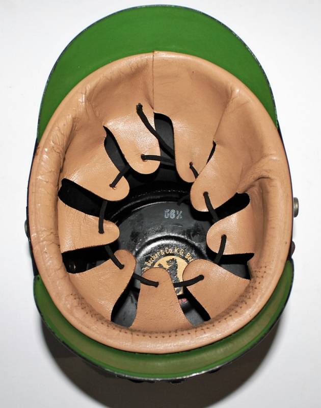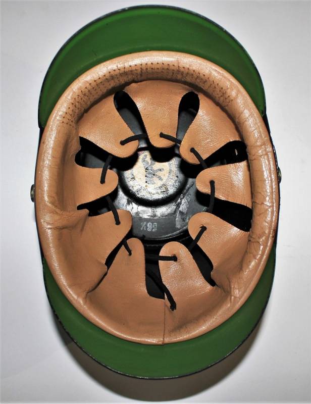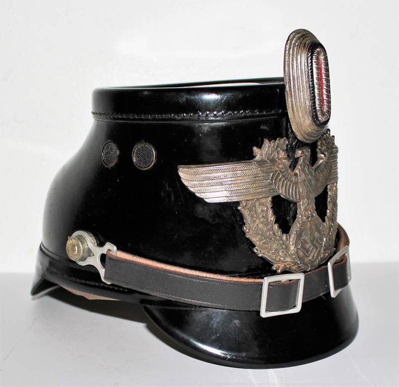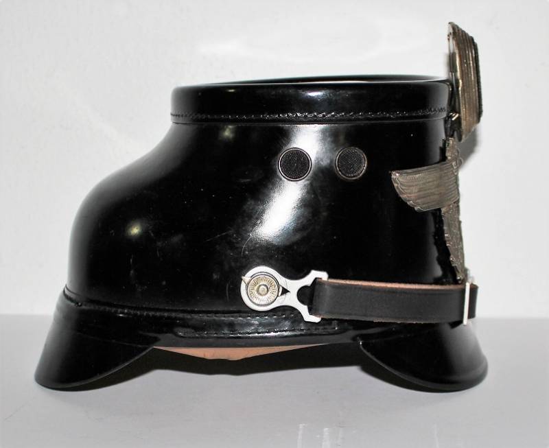 Bellissimo TshakoŽ della Polizia - Schutzpolizei, in condizioni stupende quasi pari al nuovo, non restaurato o riparato, Vulkanfiber nero perfetto non lesionato, completo di fregi molto dettagliati, leggerissima patina del tempo e dellŽuso, interno non manomesso con ottima pelle del liner, completo con allŽinterno lŽetichetta del fabbricante, taglia 56,5. Originale 100% WWII periodo.
