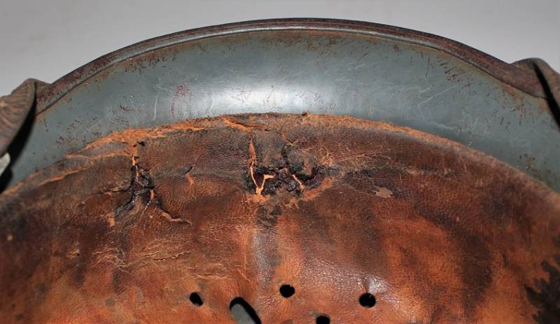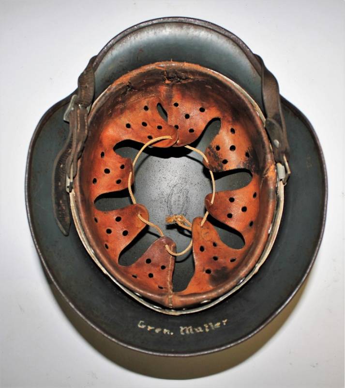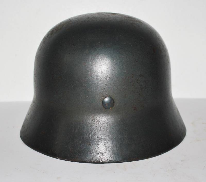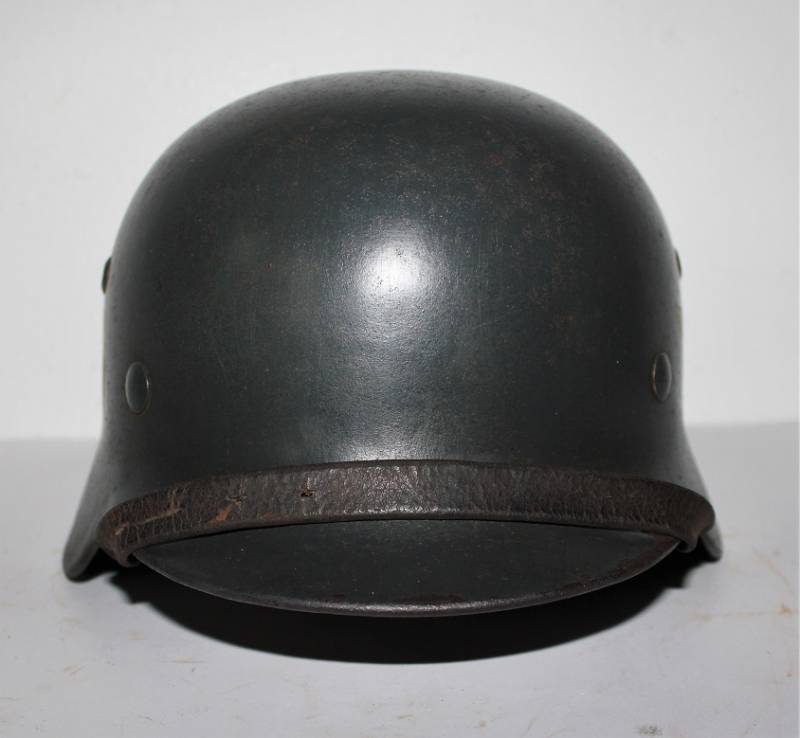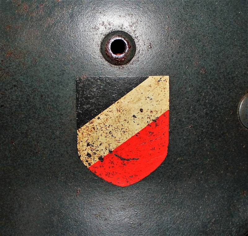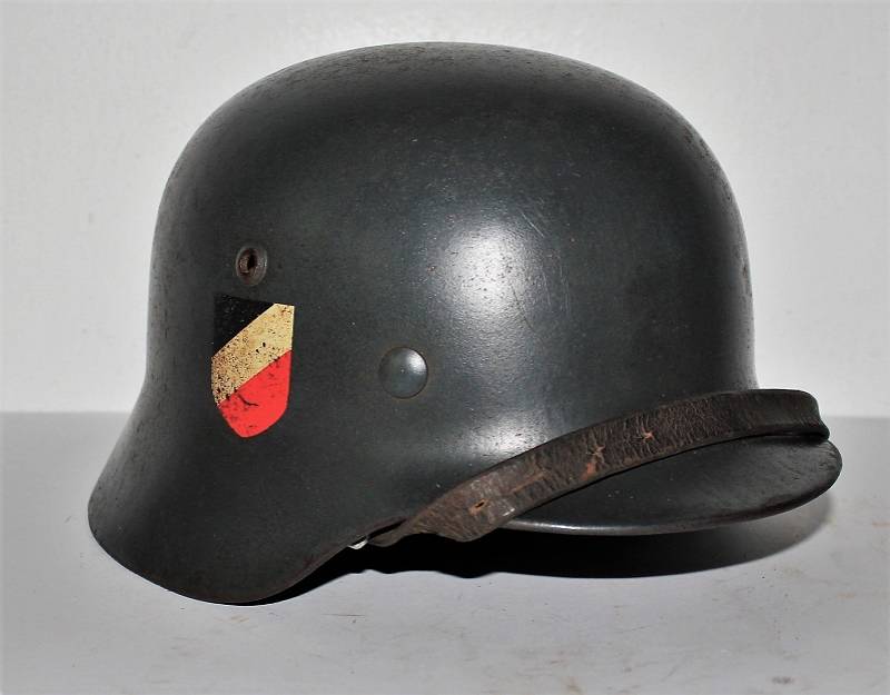 Bellissimo elmetto mod.35 bidekal della LW, ottime condizione, verniciatura blugrau 1° tipo al 90%, decalcomanie perfette quasi al 100%, leggera patina del tempo e dellŽuso, completo in ogni sua parte, interno in alluminio con rinforzi, mai smontato, piccola riparazione (non visibile) con toppa allŽinterno della pelle sulla parte frontale. Nome del soldato scritto a vernice sulla parte posteriore, ferro marcato con numero di lotto, fabbricante ET64, taglia della pelle 56-57, timbro ovale sulla calotta centrale dellŽelmo, sottogola sano con marcatura del fabbricante e data. Originale 100% WWII periodo.