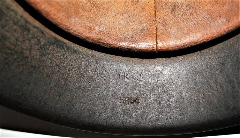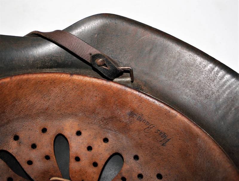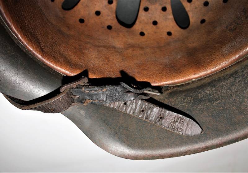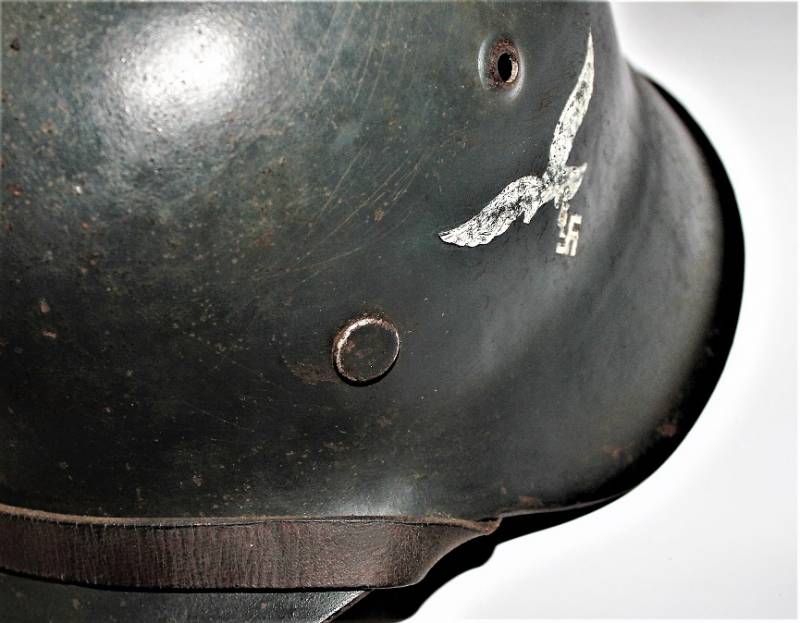 Elmetto mod.42 della LW monodekal, condizioni buone con patina del tempo e dellŽuso, mai smontato e non restaurato, completo in tutte le sue parti, verniciatura blaugrau al 90%, dekal allŽ80%, pelle del liner in ottime condizioni non lesionata, sottogola integro marcato con codice fabbricante e data 1942, nome del soldato scritto sulla pelle, marcato sul ferro con numero di lotto, codice costruttore, ferro taglia 64, taglia della pelle 57. Originale 100% WWII periodo.