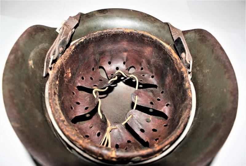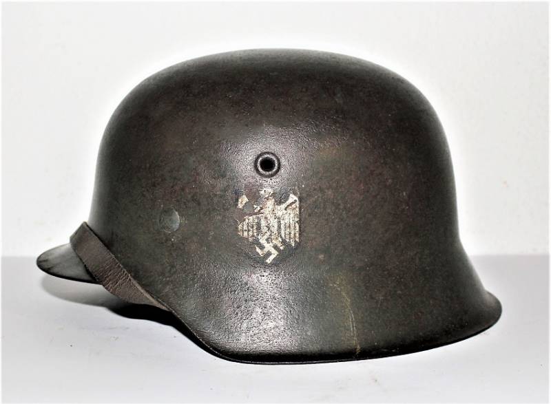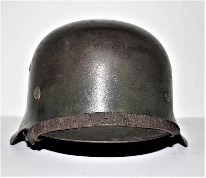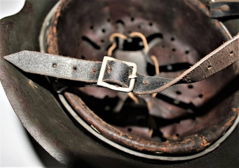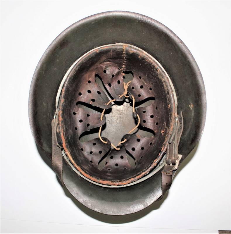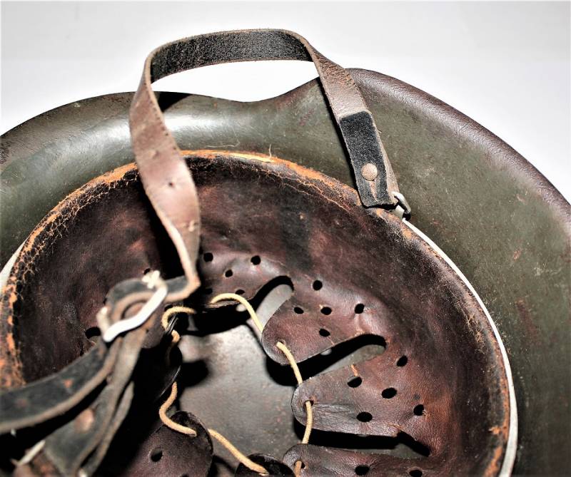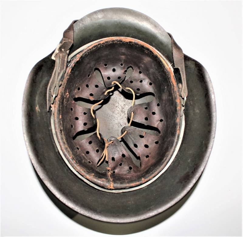 Elmetto mod.42 della WH monodekal, completo in ogni sua parte, vernice rugosa al 60%, dekal al 70% patinata dal tempo, completo in ogni sua parte, liner e sottogola mai smontati, non restaurato o riparato, pelle del liner e del sottogola vissuta ma non lesionata, il tutto con patina del tempo e dellŽuso. Ferro marcato con nome del fabbricante, numero di lotto e taglia 64 (taglia pelle 56-57), sottogola marcato con sigla fabbricante e data 1943. Originale 100% WWII periodo.