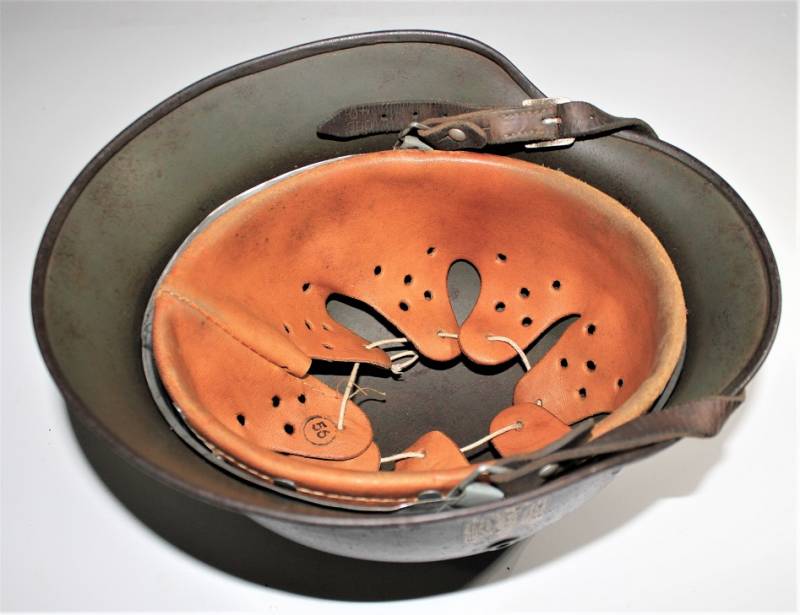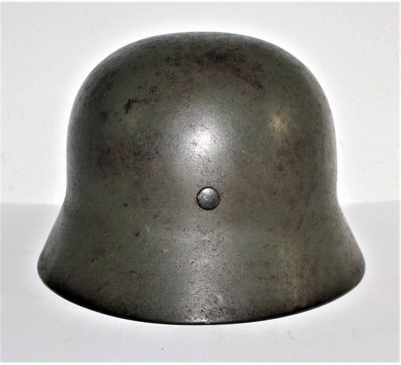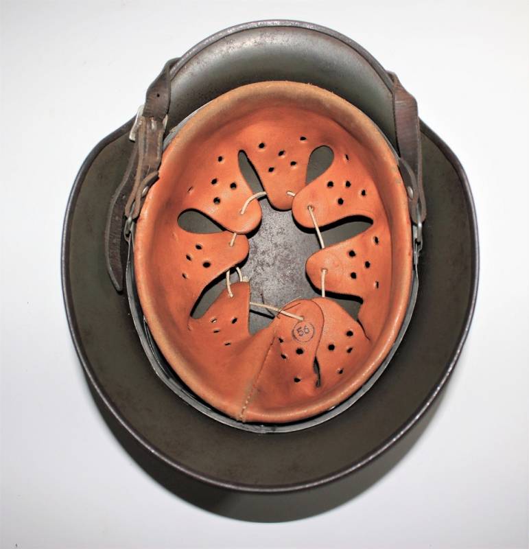 Elmetto M40 monodekal della WH in ottime condizioni, con leggeri segni del tempo e dellŽuso, non riparato o restaurato, interno e sottogola mai smontati, il tutto con leggera patina del tempo e dellŽuso, verniciatura verde feldgrau 90% circa, decalcomania patinata 85-90%, marcato internamente sul ferro, con numero di lotto, sigla del fabbricante e taglia 64, pelle marcata taglia 56, sottogola marcato con sigla del fabbricante e anno 1940. Sulla calotta interna, si intravede leggermente la marcatura ovale del fabbricante. Originale 100% WWII periodo.
