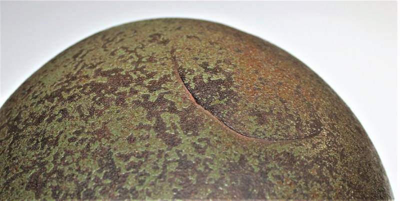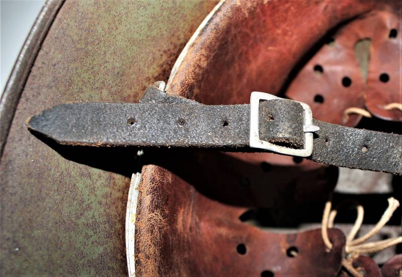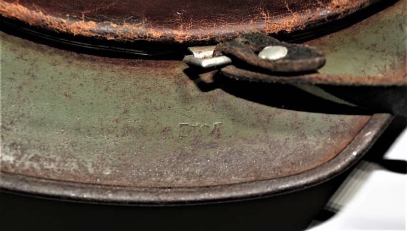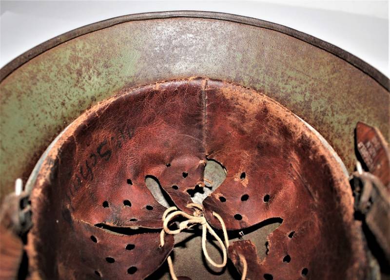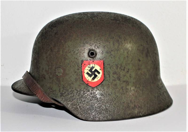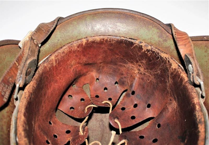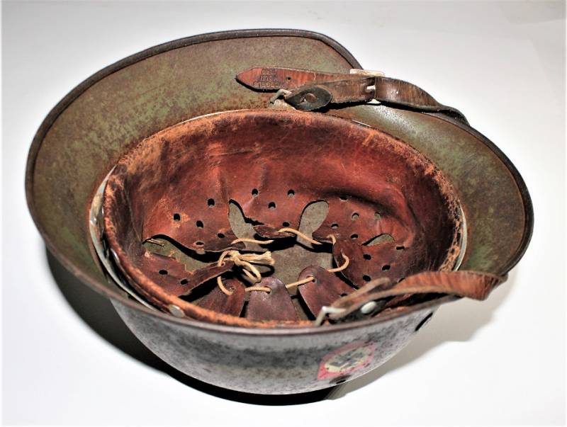 Elmetto mod.35 W.SS bidekal verde pisello di primo tipo, condizioni molto vissute con patina di ruggine e dŽuso, vernice verde chiaro al 50-60% con una lesione del metallo di di circa 4 cm. sulla calotta, interno e sottogola mai smontati, vissuti dal tempo e dallŽuso con pelli ancora in buono stato, cerchione del liner in alluminio di 2°tipo con rinforzi con forme per elmo mod.35. Decalcomanie patinate ma ancora ben visibili 80-90%. Marcato sul ferro con numero di lotto, marchio del fabbricante ET64, taglia pelle 57. Originale 100% WWII periodo.