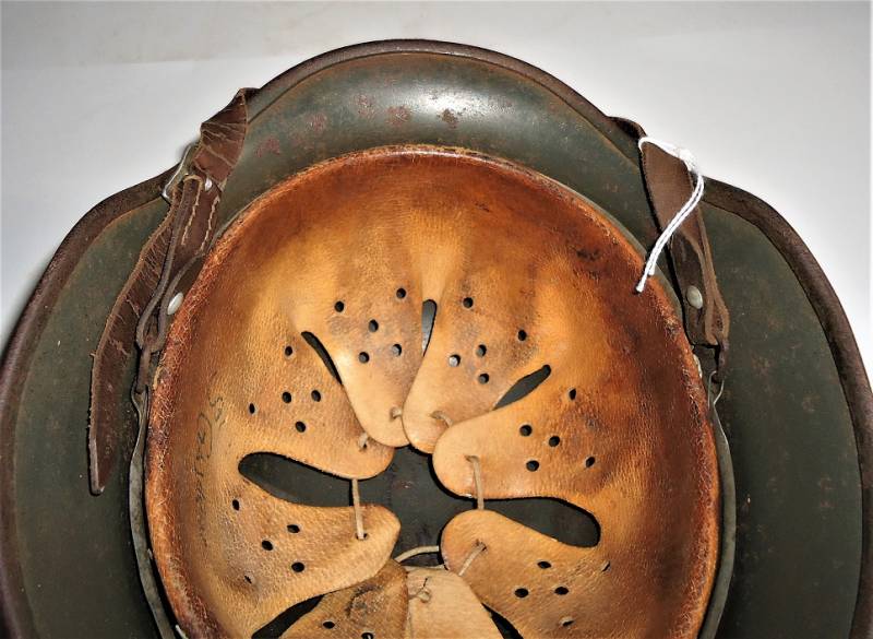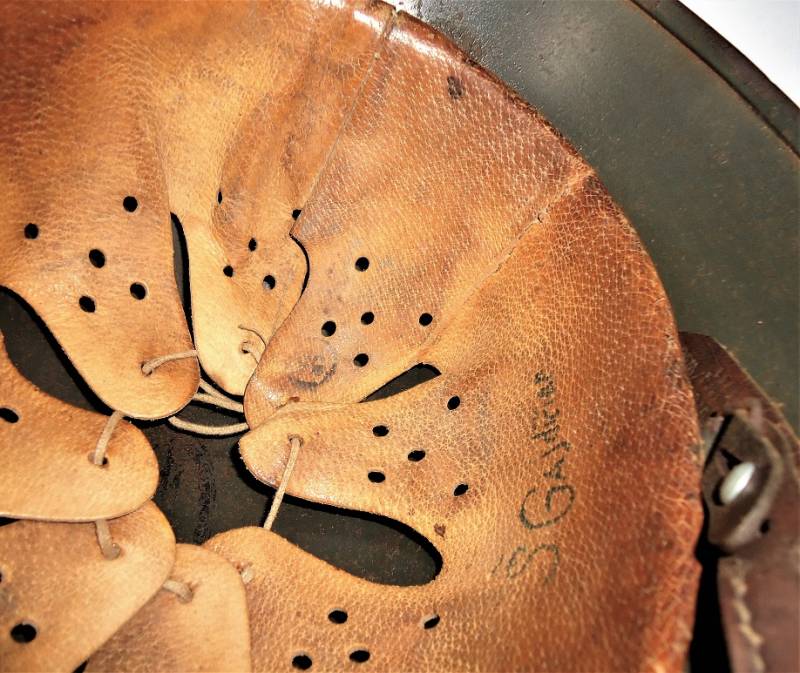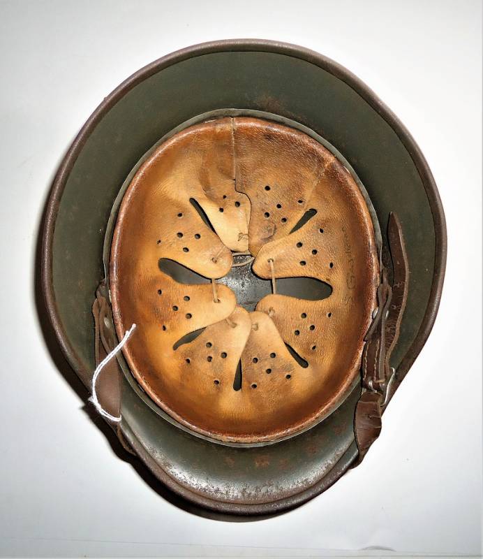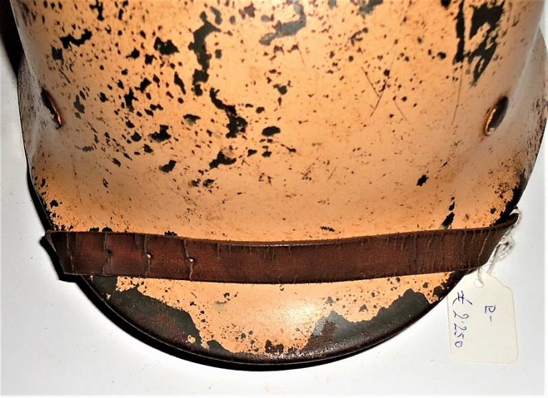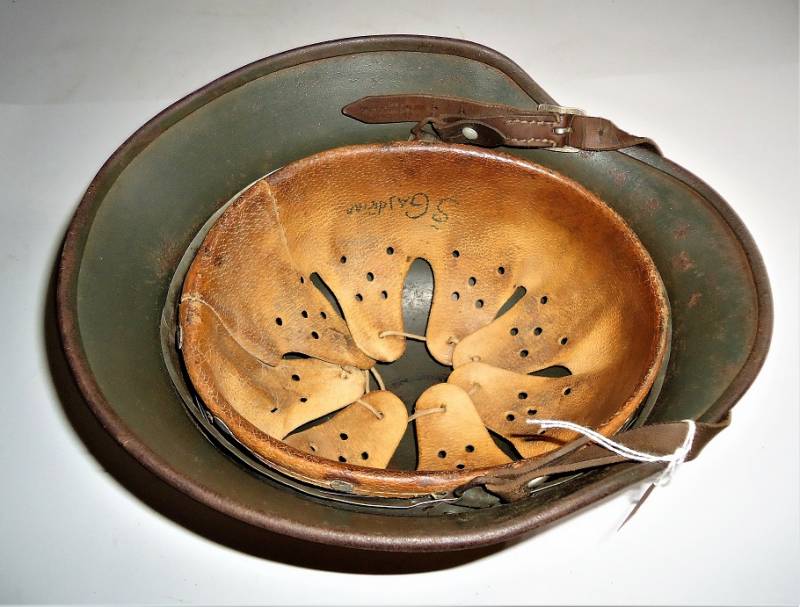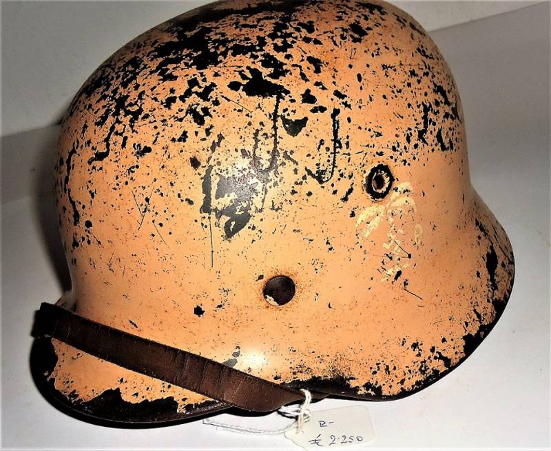 Elmetto M40 tropicale DAK in ottime condizioni, con leggera patina del tempo e dellŽuso, completo in ogni sua parte, non restaurato o riparato, interno e sottogola mai smontato, colorazione gialla tropicale Afrika al 70%, sul lato sinistro "palmetta" disegnata a mano dal soldato con simbolo reggimentale. Taglia del ferro 64, taglia della pelle 56-57, sottogola marcato con il nome del fabbricante e anno 1941. Sul lato destro della pelle del liner è scritto il nome del soldato. Originale 100% WWII periodo.