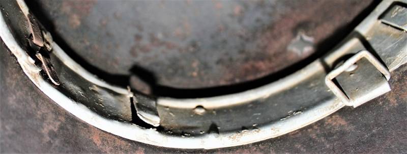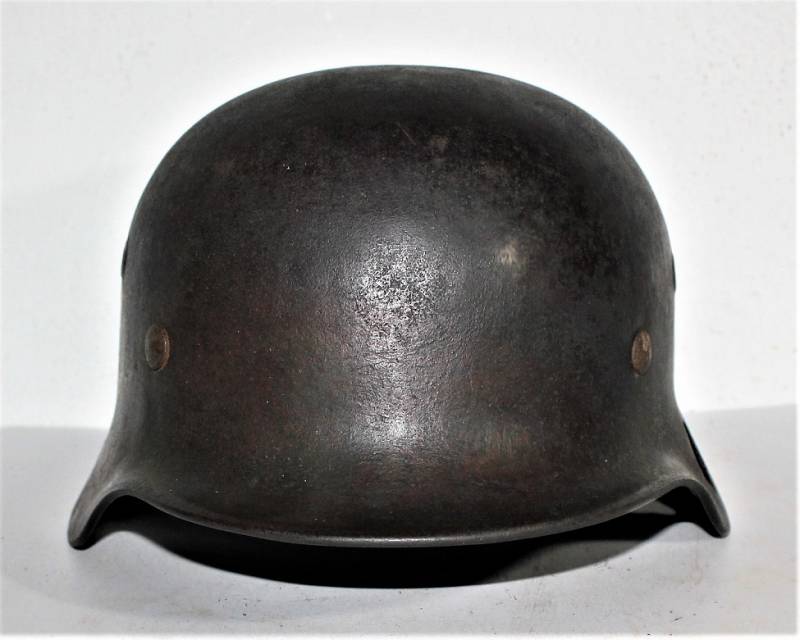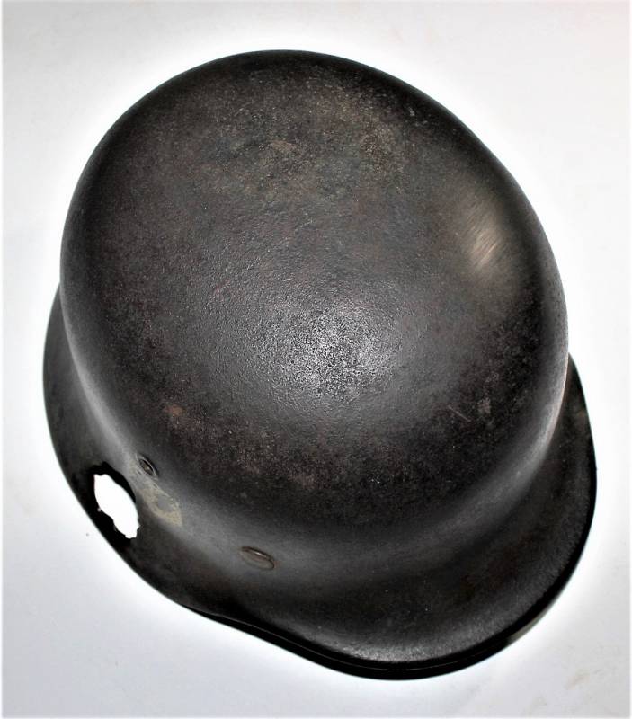 Elmetto M40 W.SS monodekal danneggiato, condizioni discrete ancora con parte della sua vernice, ma in parte anche ruggine, sul lato sinistro è presente un foro da scheggia e su entrambi i lati due fori fatti dopo guerra, la dekal si presenta ancora in ottime condizioni, ovviamente patinata da tempo ma al 60%, lŽinterno ha ancora il suo cerchione dŽalluminio di 1°tipo mai smontato, ferro marcato con numero di lotto. Taglia dellŽelmo 64. Originale 100% WWII periodo.