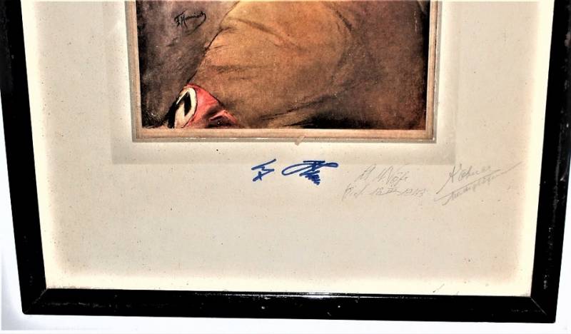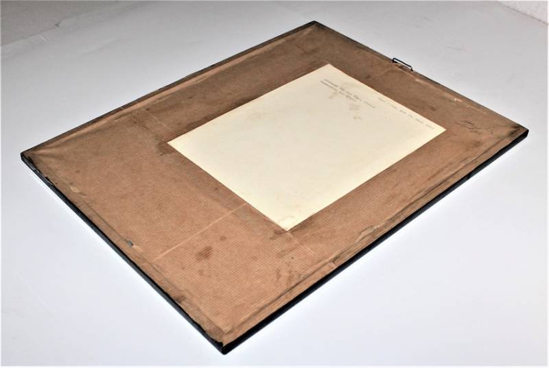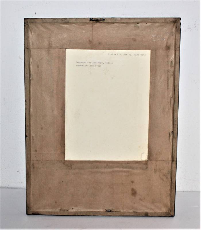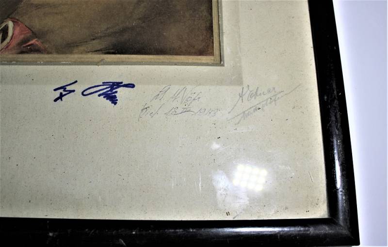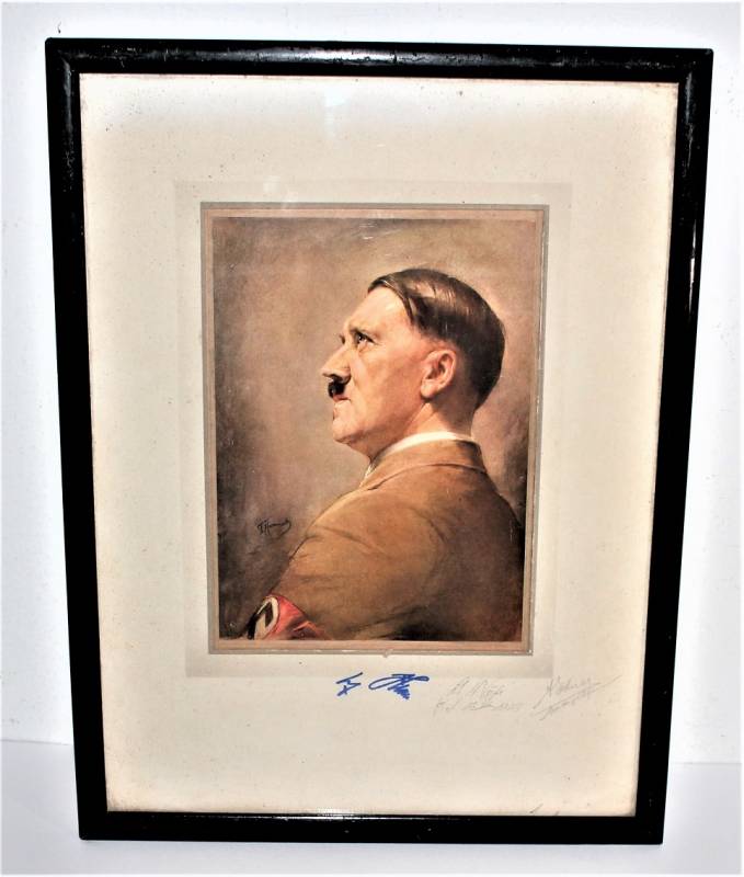 Raro e bel quadro raffigurate lŽimmagine Adolf Hitler di profilo, con firma del pittore, completo della sua cornice originale e firma a tampone di Adolf Hitler, condizioni ottime e mai smontato, solo con leggera patina del tempo e dellŽuso, sul retro del quadro sono presenti le scritte del posto (Kiel) e la data 13 Marzo 1943, appartenuto al Capitano di Vascello Ulrich Voge comandante dellŽU-BOOT U239, probabilmente il quadro si trovava nella cabina del comandante.