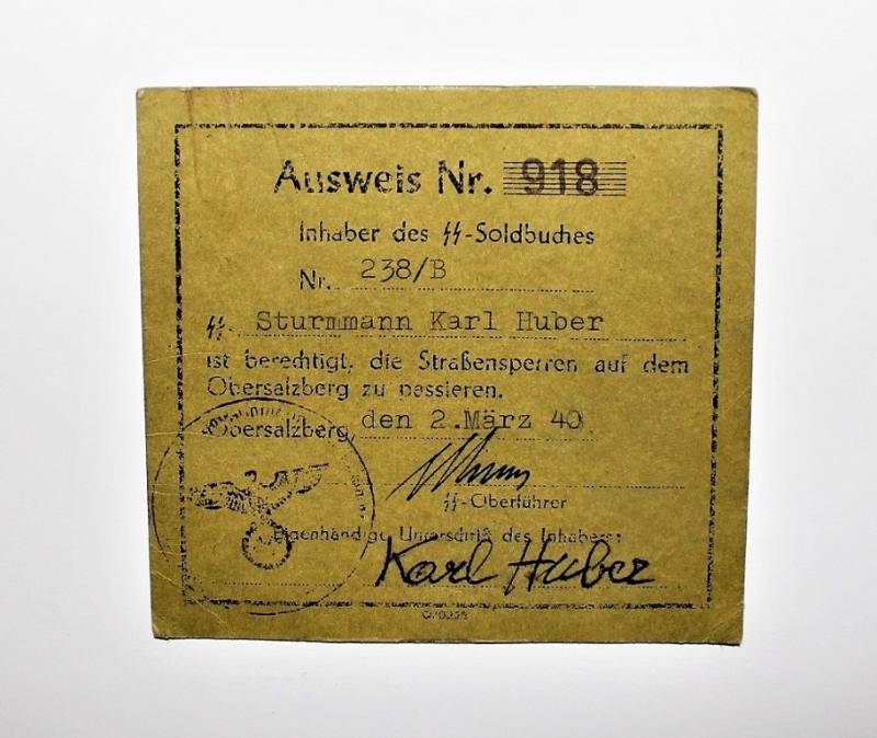 Ausweis-lasciapassare cartaceo nominativo appartenuto all´Ufficiale SS STURMMANN-KARL HUBER. Documento per usufruire del passaggio dei posti di blocco per l´OBERSALZBERG. Condizioni ottime! Raro e originale 100% WWII periodo.