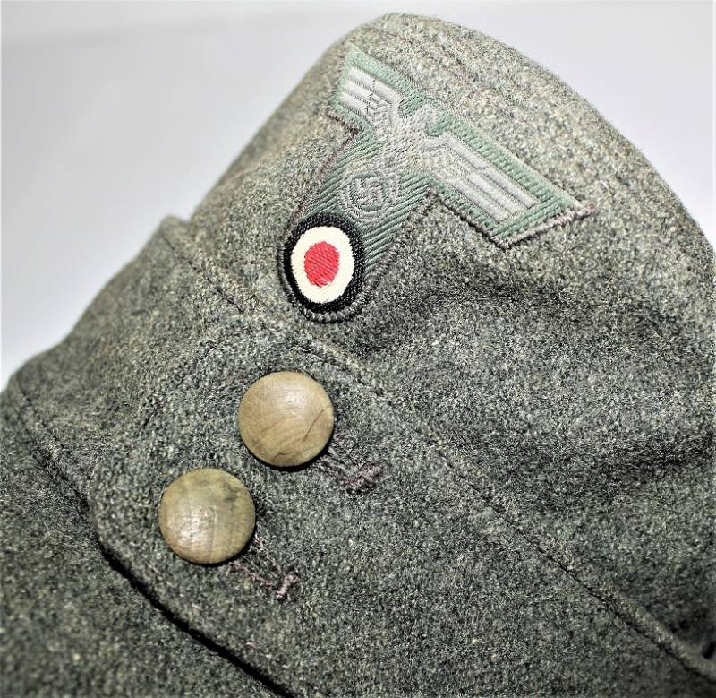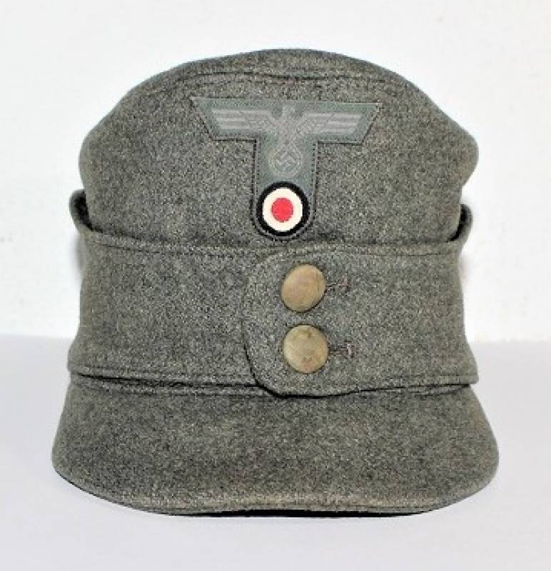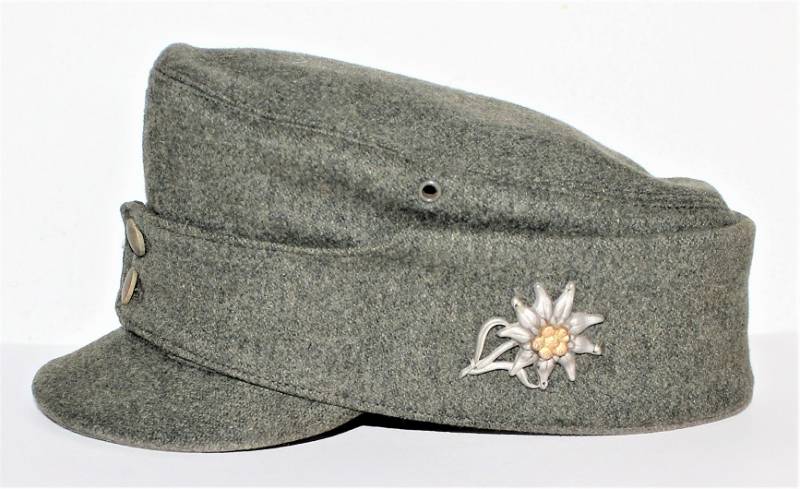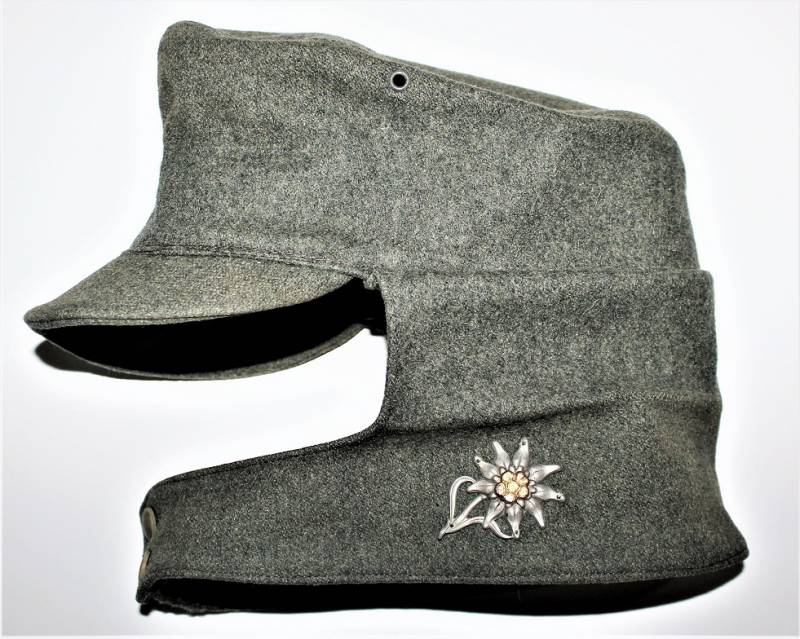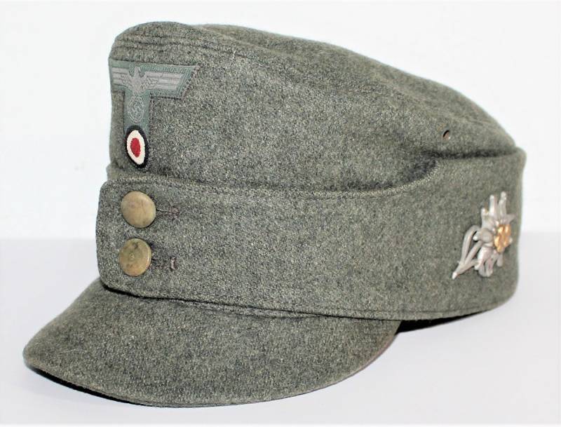 Berretto M41 da Truppa Gebirgsjäger WH in condizioni ottime, completo in ogni sua parte, non restaurato o riparato, senza buchi o strappi, cuciture perfette, fregi montati in epoca, edelweiss montato sul lato sinistro in epoca, il tutto solo con leggera patina del tempo e dell´uso, costruzione regolamentare per berretto Gebirgsjäger.
