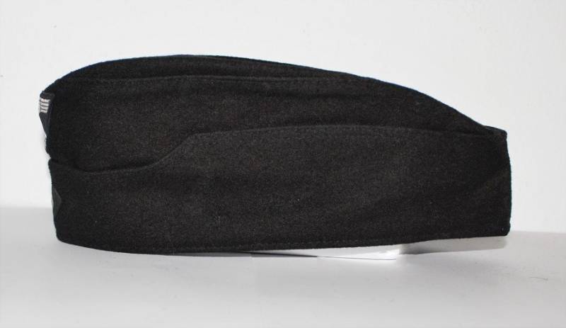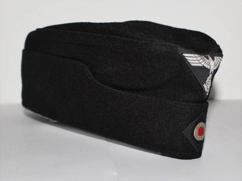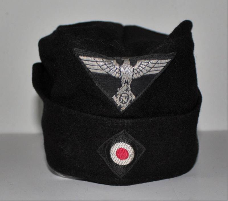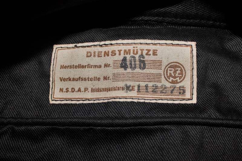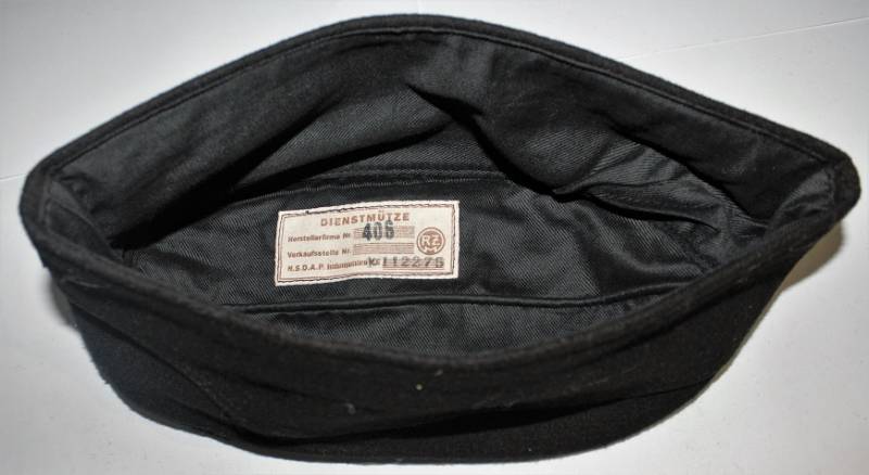 Bustina N.S.D.A.P. della TeNo in condizioni stupende pari al nuovo, mai usata, fondo di magazzino, nata in panno di lana nero, con fregi Bevo ricamati in filo metallico argentato cuciti a macchina dŽepoca, internamente cartellino cucito N.S.D.A.P RZM, con numeri di lotto del produttore. Taglia 56-57. Originale 100% WWII periodo.