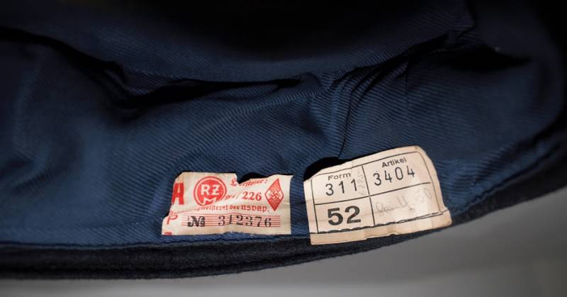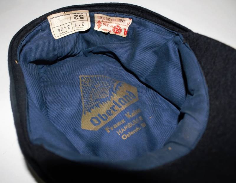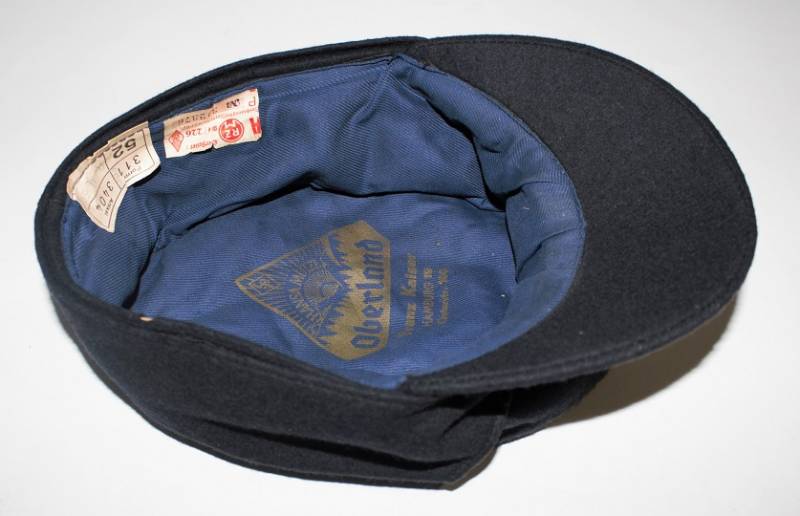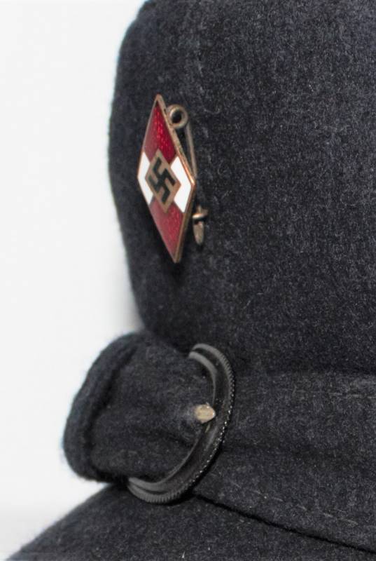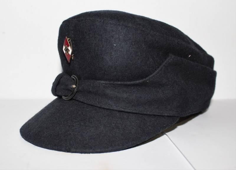 Berretto della H.J. Gioventù Hitleriana in ottime condizioni, mai usato fondo di magazzino. Completo in ogni sua parte, realizzato in panno di lana blu, con fregio regolamentare smaltato delle H.J., interno marcato con logo fabbricante, cartellino del costruttore con numero articolo, taglia 52, ecc.. e cartellino dŽaccettazione uffici RZM H.J. Originale 100%. WWII periodo.
