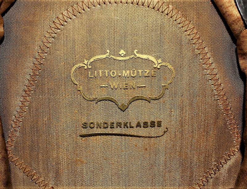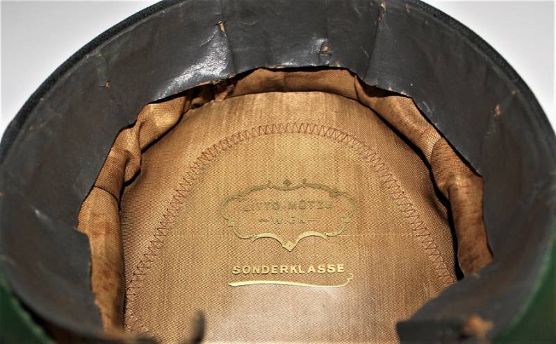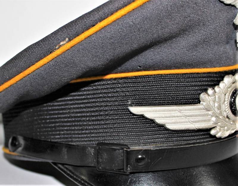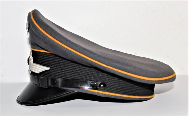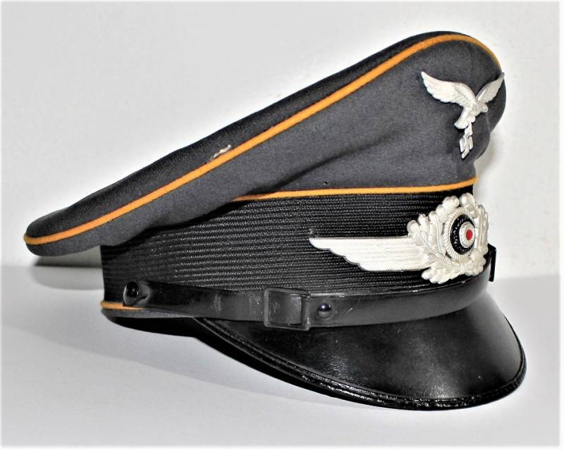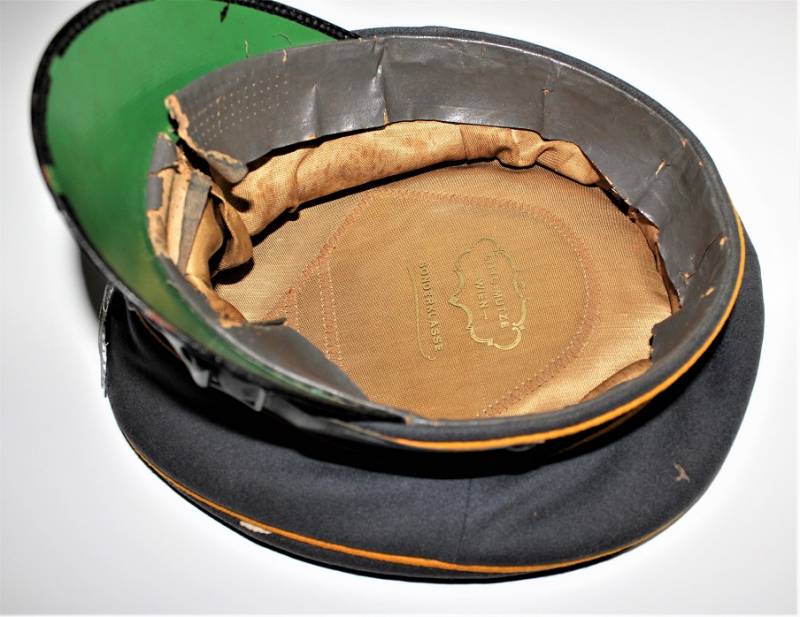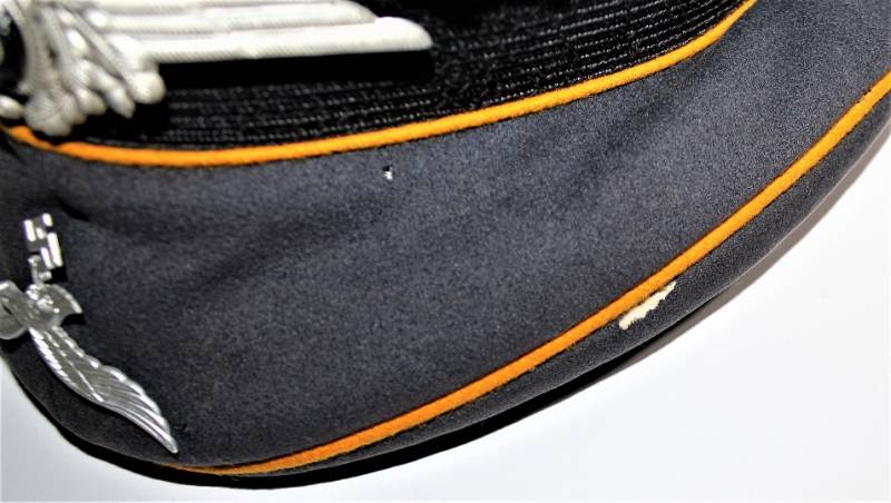Schirmmutze da Sottufficiale della LW waffenfarbe giallo per paracadutisti o personale di volo, condizioni discrete, bella forma, completo in ogni sua parte. Interno purtroppo lesionato sulla parte interiore, completo con diamante di celluloide con nome del fabbricante. Originale 100% WWII periodo.