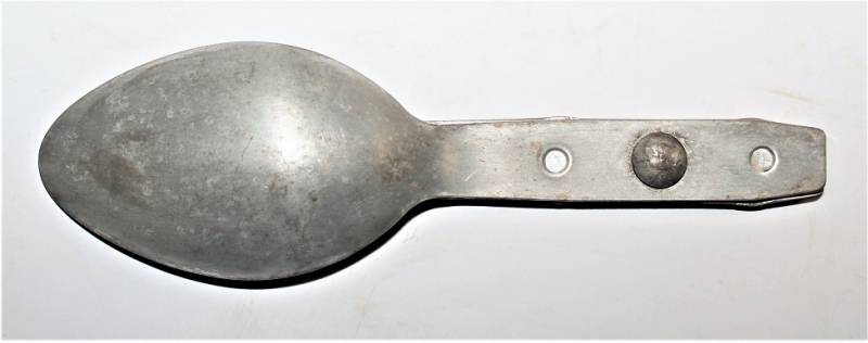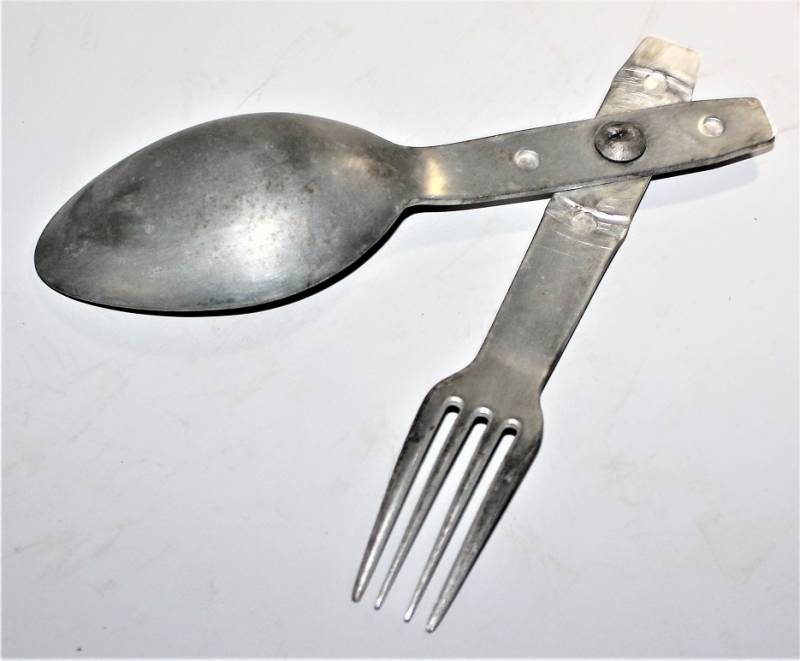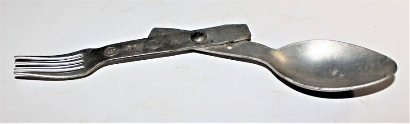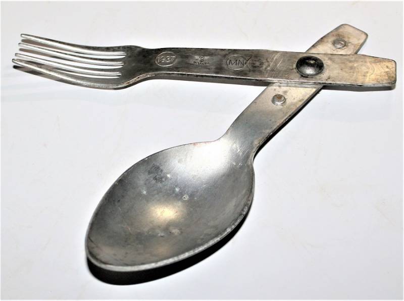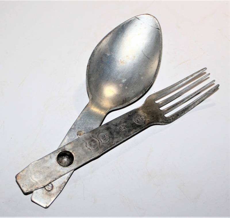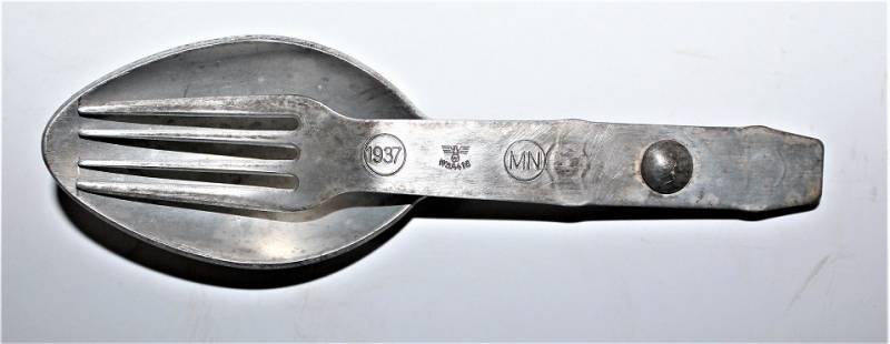 Set cucchiaio e forchetta WH-LW-SS in alluminio fornitura dei magazzini dellŽesercito. Condizioni buone con patina del tempo e dellŽuso, marcato con codice fabbricante MN, data 1937 e waffenamt. Originale 100% WWII periodo.