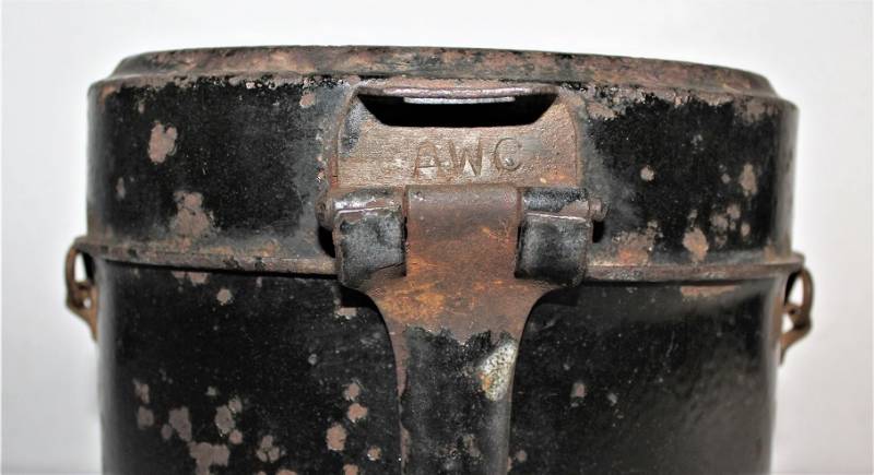 Gavetta M31 nata in colorazione nera al 70-80%, completa in ogni sua parte, non restaurata o riparata, con leggeri segni del tempo, di ruggine e dellŽuso, marcata con codice fabbricante, probabilmente Algemine SS. Originale 100% WWII periodo.