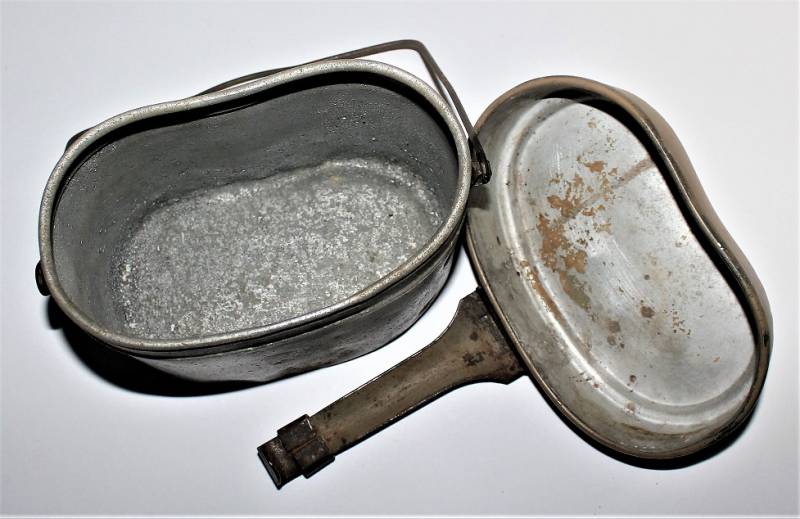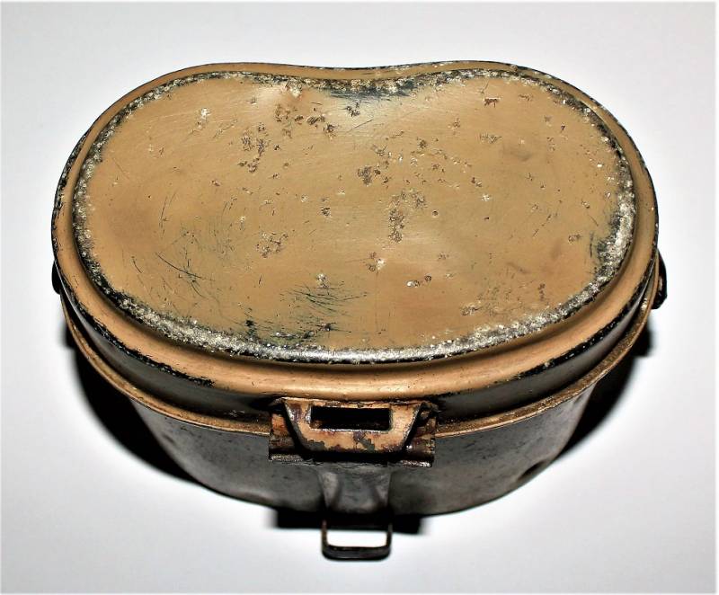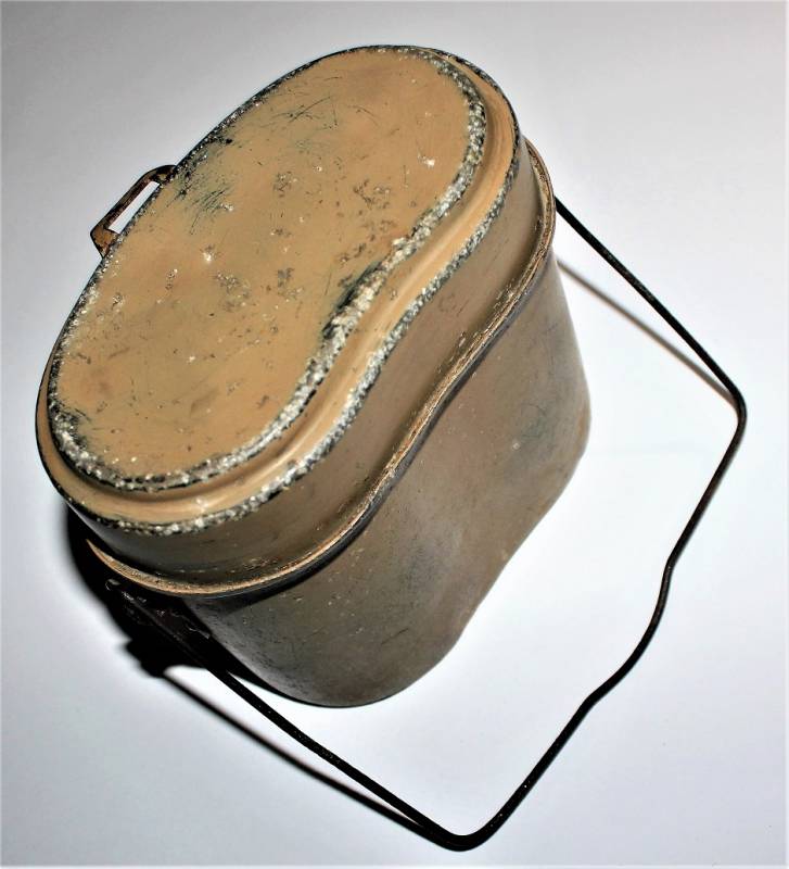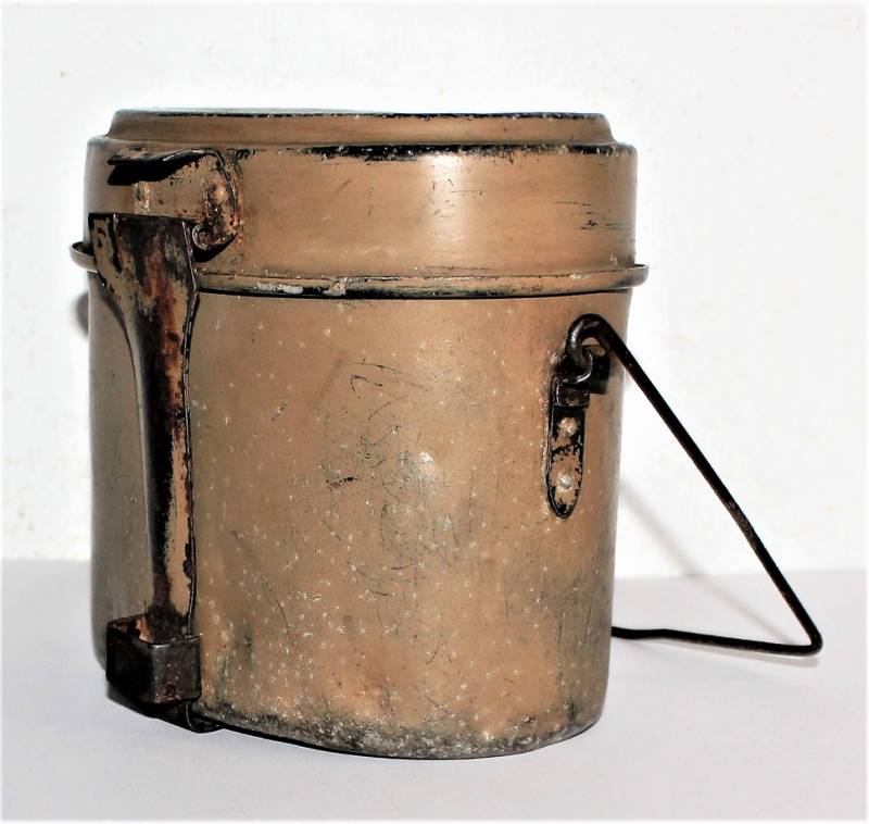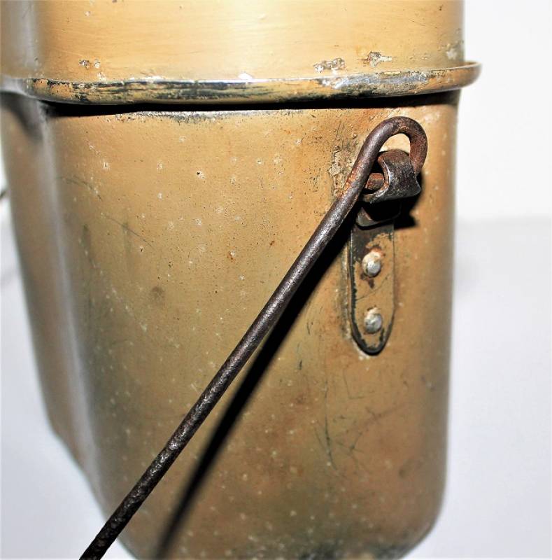 Rara gavetta in alluminio tropicale DAK in buone condizioni e completa, solo con patina del tempo e dellŽuso, non restaurata o riparata, verniciatura mimetica allŽ80-90%, non marcata.